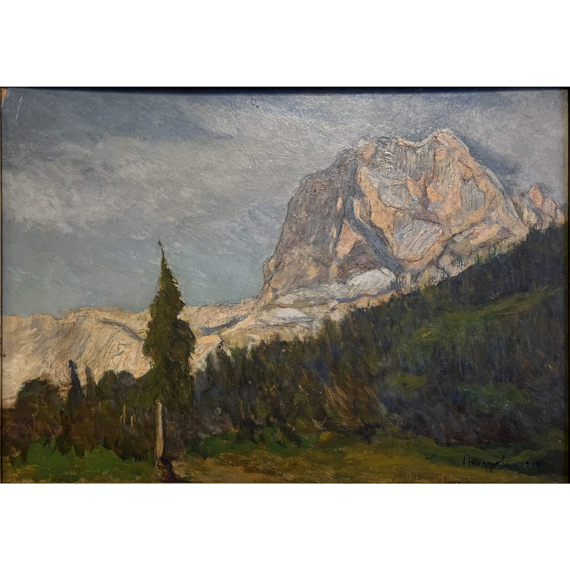 Umberto Moggioli (1915) Paesaggio, olio su compensato, 27x38 cm. Con cornice cm 32x43. Firmato in basso a dx. Opera esposta presso il Palazzo Conti Martini, sede di rappresentanza della Cassa Rurale di Mezzocorona