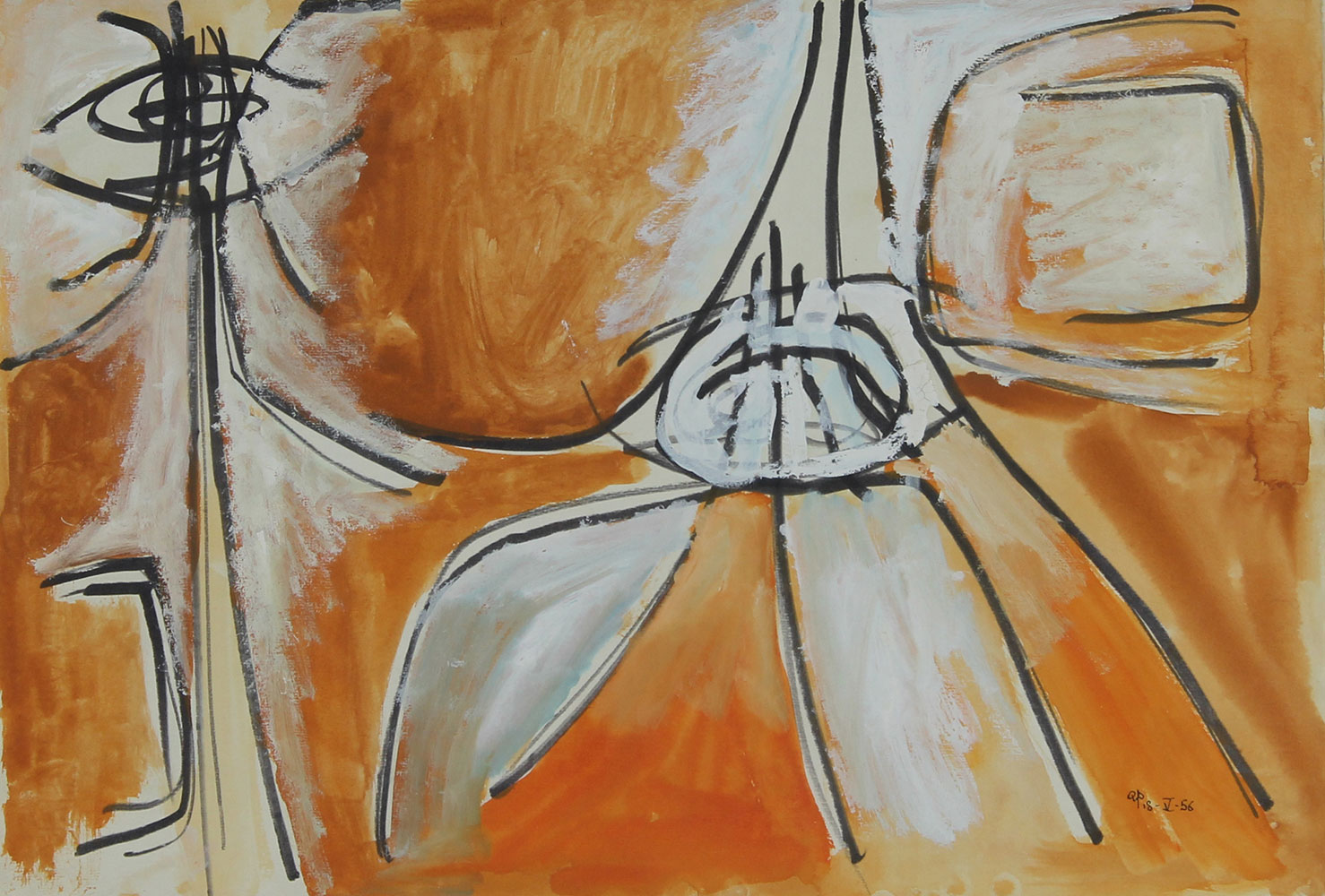 Perilli Achille Senza titolo, 1956 tecnica mista su carta, cm. 33,7x48 siglata e datata in basso a destra, etichetta della galleria La Scaletta di Reggio Emilia al retro, certificato di autenticità e archiviazione dell'artista su fotografia del 24/10/2005, opera pubblicata su "Achille Perilli - Carte 1946-1957", Edizioni La Scaletta, 2005, p. 104