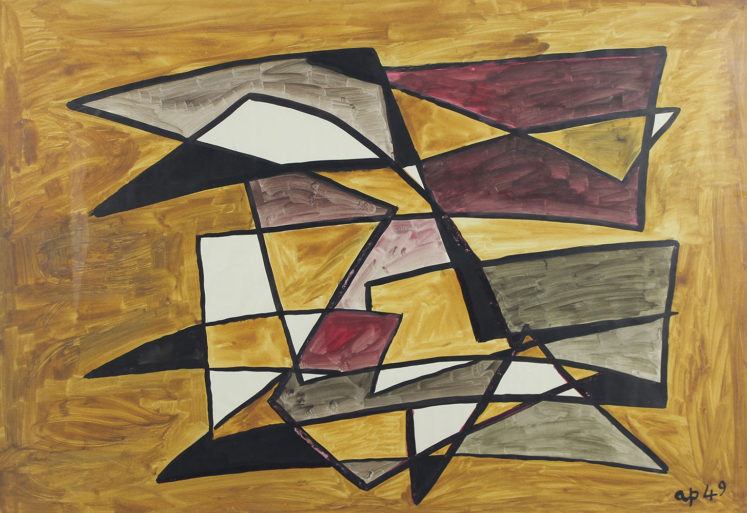 Perilli Achille Senza titolo, 1949 tecnica mista su carta, cm. 69,8x100 siglato e datato in basso a destra, etichetta della galleria La Scaletta di Reggio Emilia al retro, certificato di autenticità e archiviazione dell'artista su fotografia del 26/10/2005, opera pubblicata su "Achille Perilli - Carte 1946-1957", Edizioni La Scaletta, 2005, p. 40