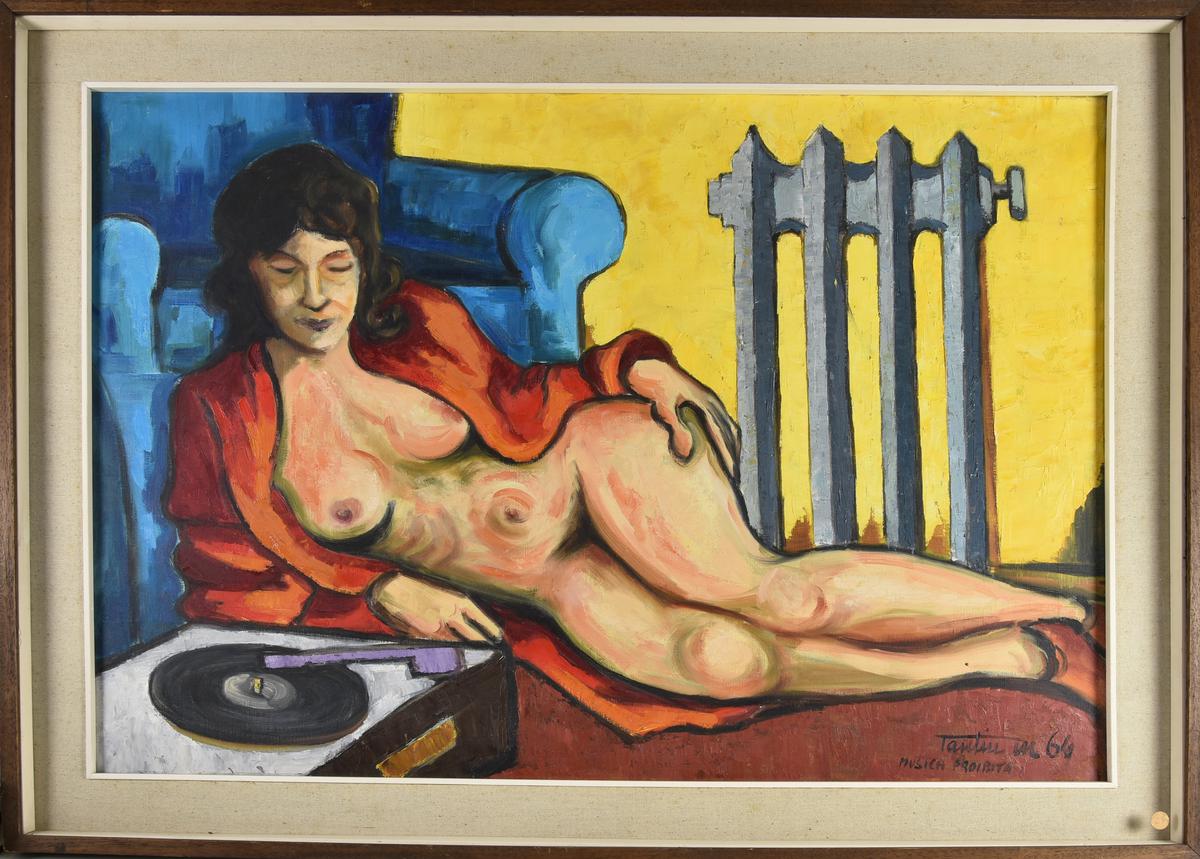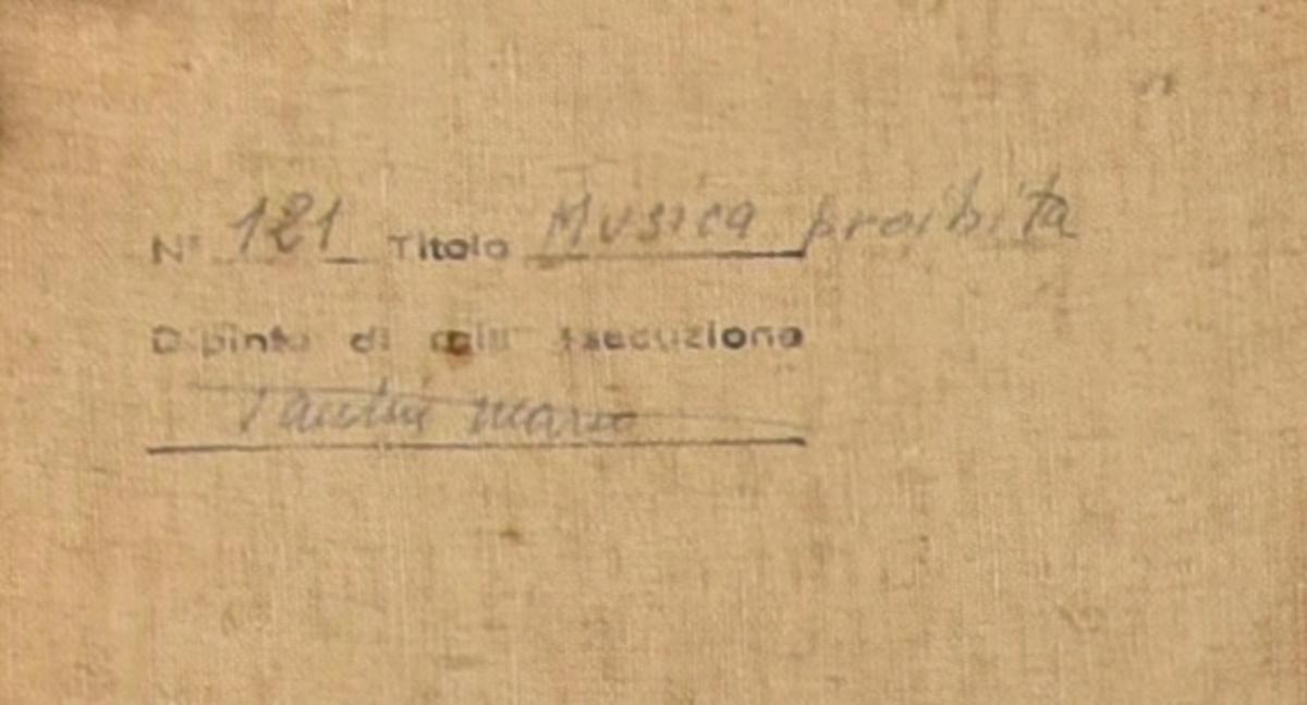 Mario Tantin MUSICA PROIBITA, 1964 olio su tela, cm 70x100 firma, titolo e...