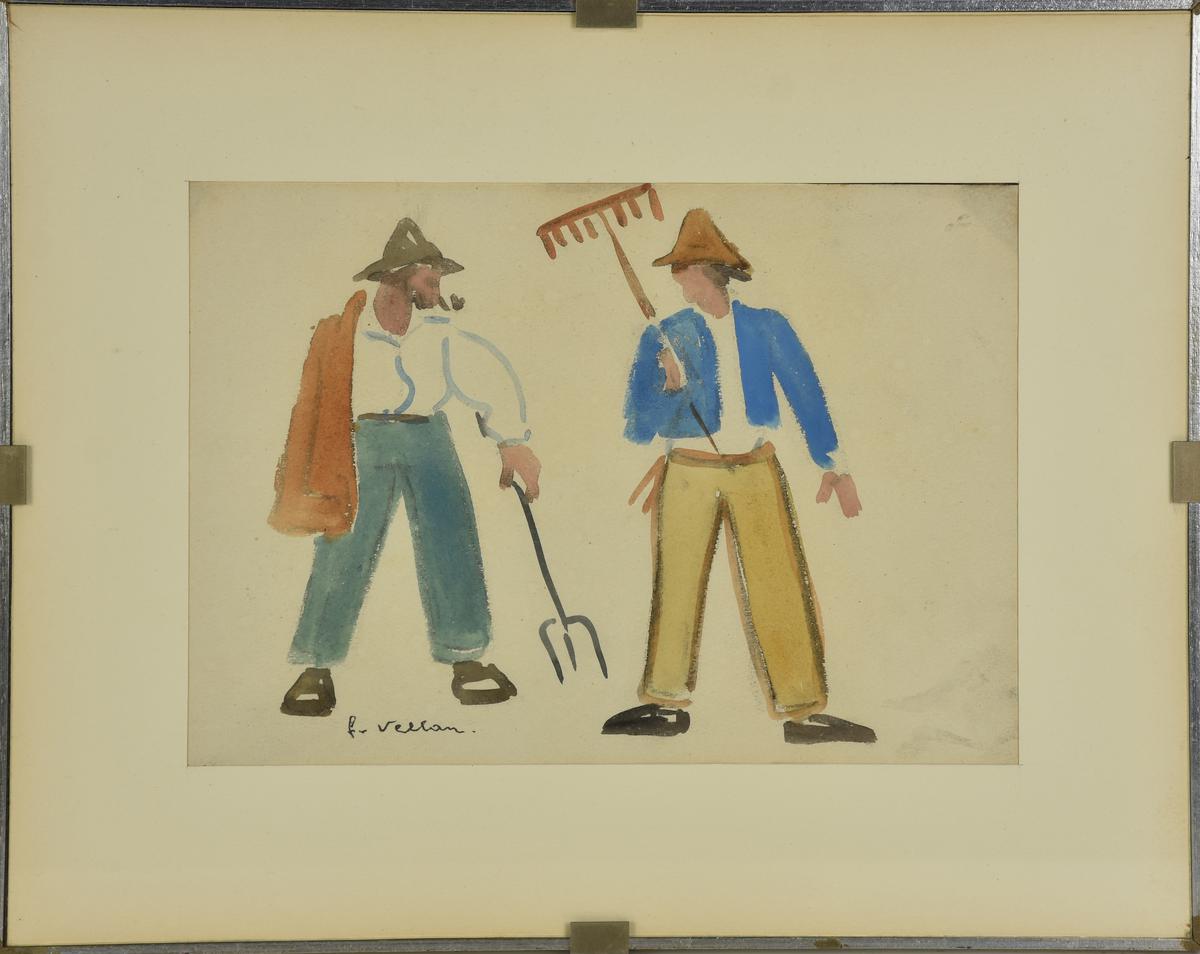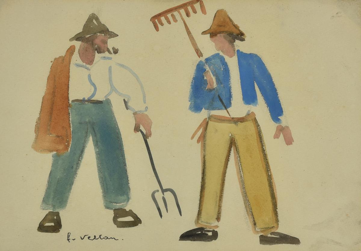 Felice Vellan CONTADINI acquerello su carta, cm 18x26 firma