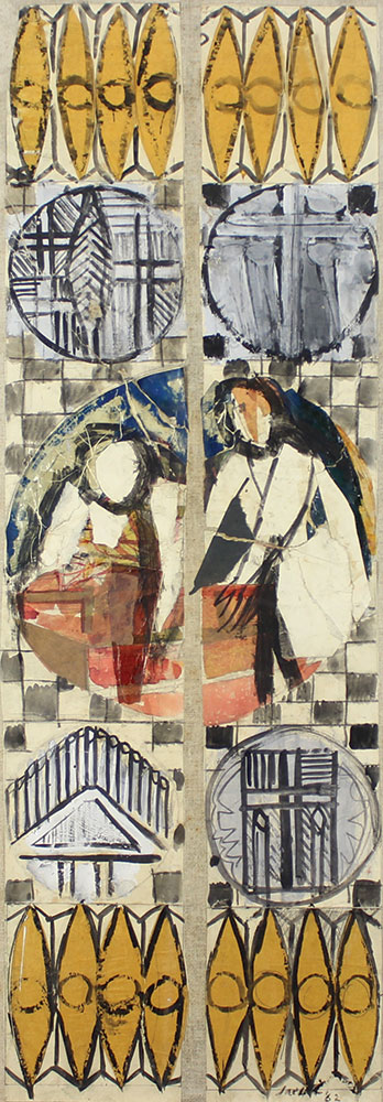 Saetti Bruno Senza titolo, 1962 tecnica mista su carta applicata su tela, cm. 100x35 firmata e datata in basso a destra, etichetta della Galleria Modenarte di Modena al retro, bozzetto per la vetrata della Chiesa di San Giovanni Bosco in Roma, pubblicata sul catalogo della mostra "Bruno Saetti. Bozzetti per la vetrata della chiesa di S. Giovanni Bosco in Roma. Tempere e grafica dal 1962 al 1972" tenutasi il 21/12/1973 presso la Galleria Pananti di Firenze