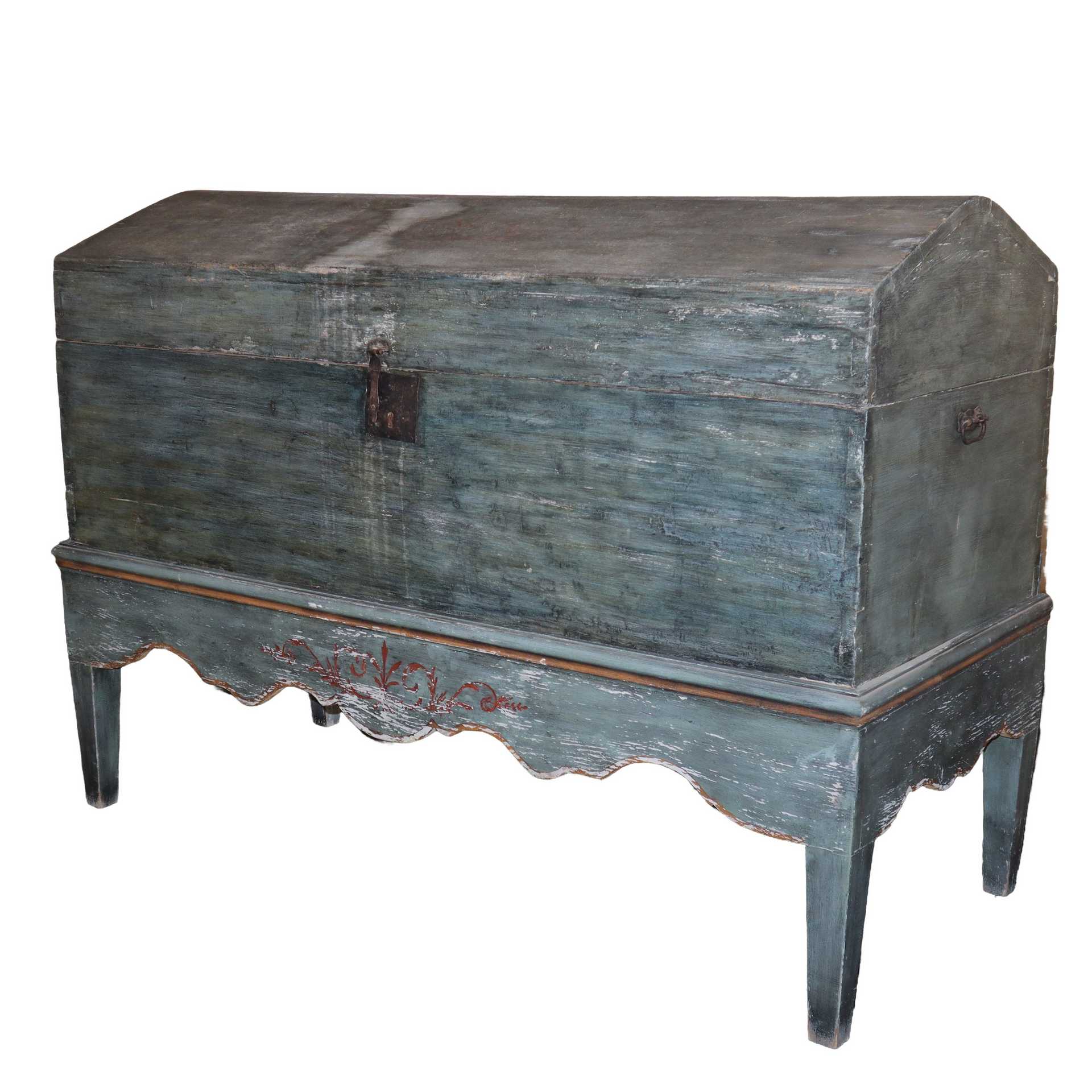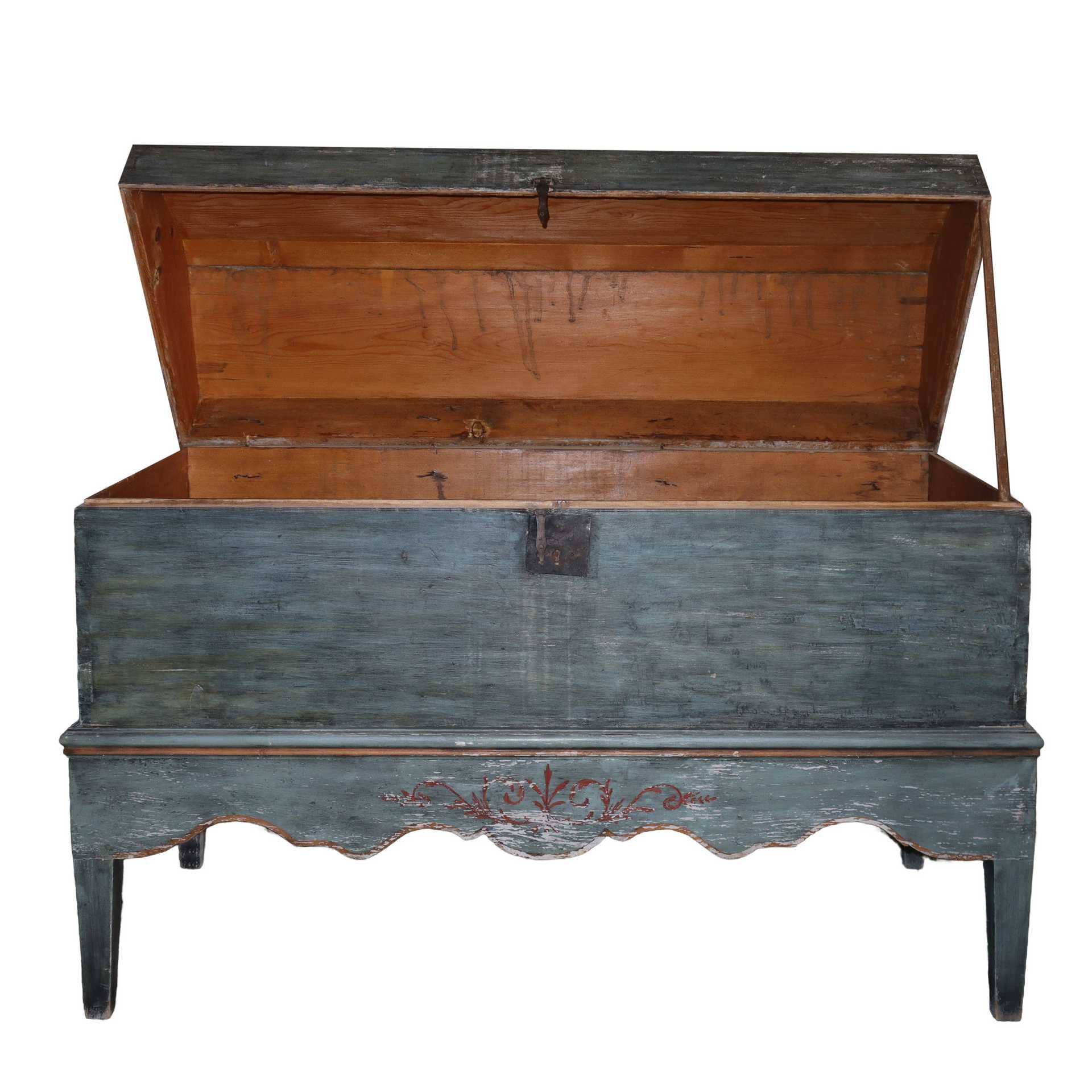 Cassapanca in legno di abete dipinta azzurro polvere, Sicily, Sciacca fine 18° secolo H cm 112x155x66 Su base con piedi troncopiramidale, copertura bombata con fregio dipinto, base staccabile.Su base con piedi troncopiramidale, copertura bombata con fregio dipinto, base staccabile.