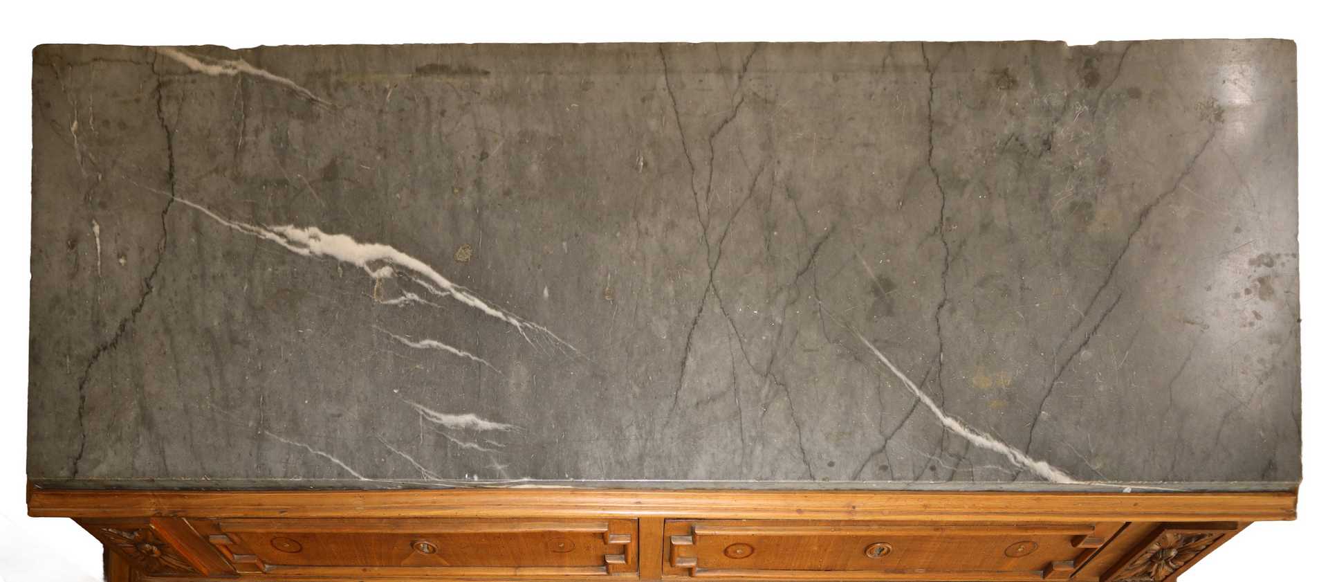 Consolle in legno di noce marmo grigio bardiglio al piano due cassetti sottopiano e piedi a colonna rastremata, fine 19° secolo cm 102X136X53