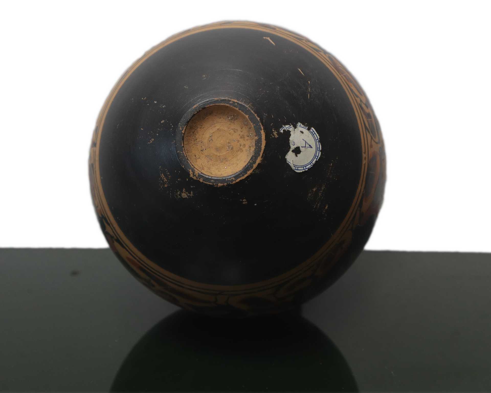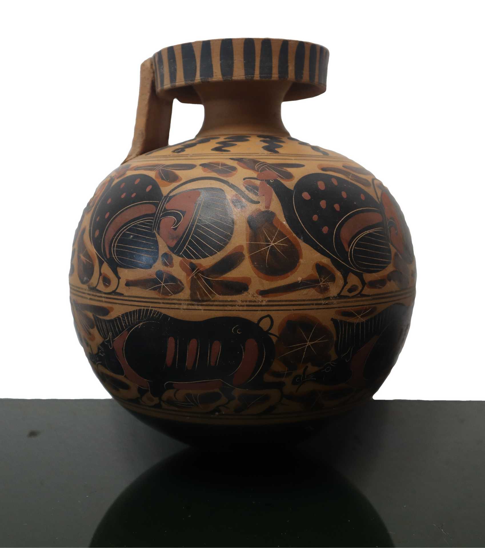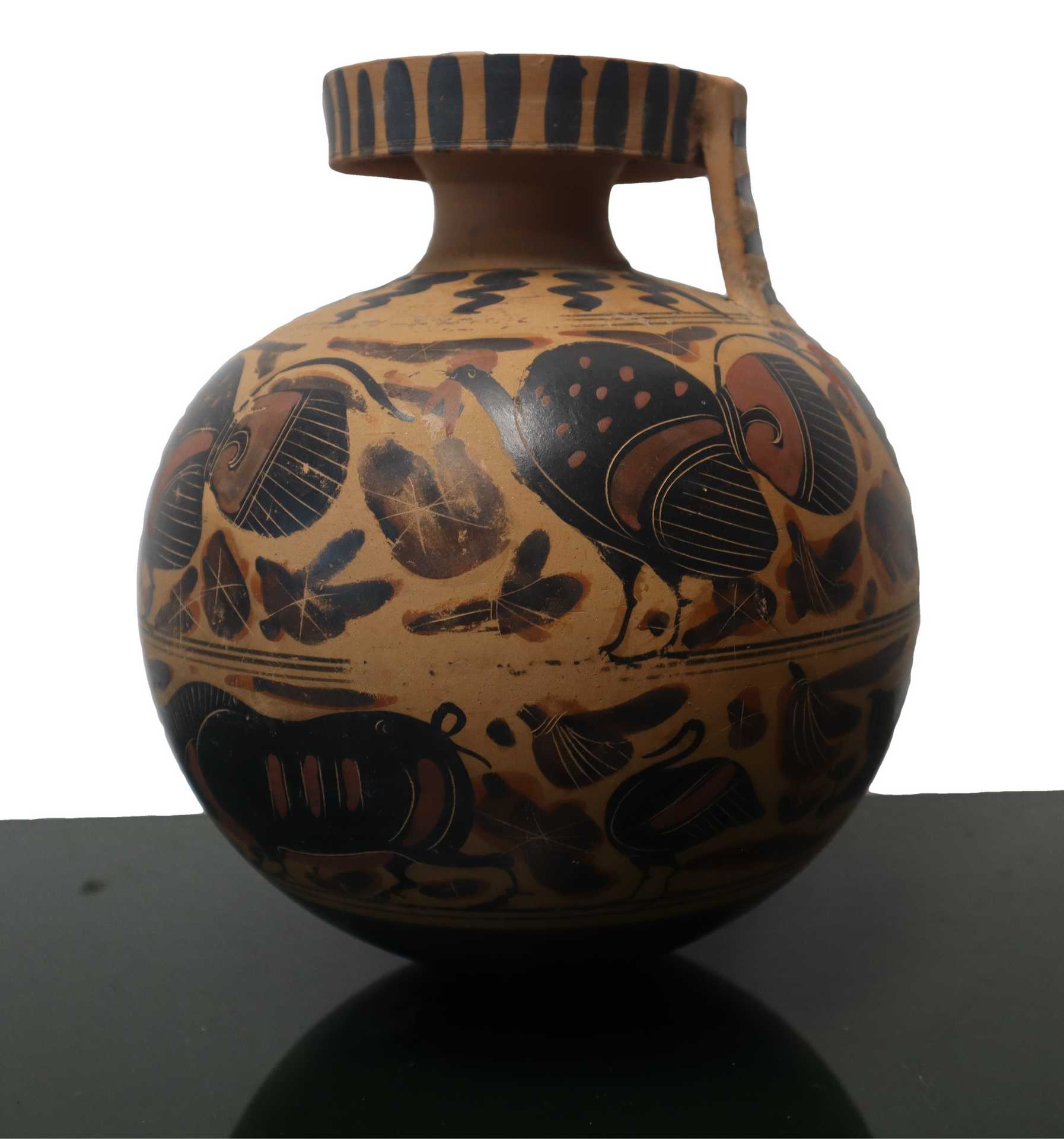 Riproduzione Ariballo. Commerciabile giusto parere Soprintendenza per i beni culturali ed ambientali di Catania del 13/12/22 N° protocollo 19871 cm 21, diametro bocca cm 9,5 terracotta dipinta Riproduzione archeologica,Vaso globulare con manico collo stretto ed ampio collo piatto. Anza sull'orlo e sulla spalla. Raffigurazioni mitilogiche. Commerciabili giusto parere Soprintendenza per i beni culturali ed ambientali di Catania del 13/12/22 N° protocollo 19871
