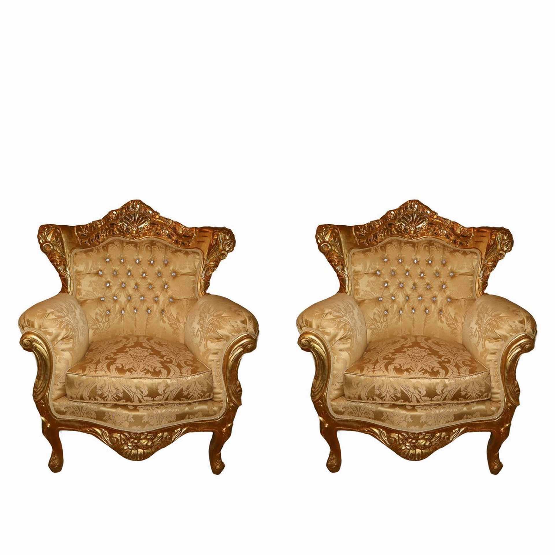 Coppia di poltrone in stile barocco in legno dorato, 20° secolo H cm 118 L cm 92 Tapezzeria damascata con spalliera capitonnè e bottoni in cristallo, stile Luigi XIV,Tapezzeria damascata con spalliera capitonnè e bottoni in cristallo, stile Luigi XIV,