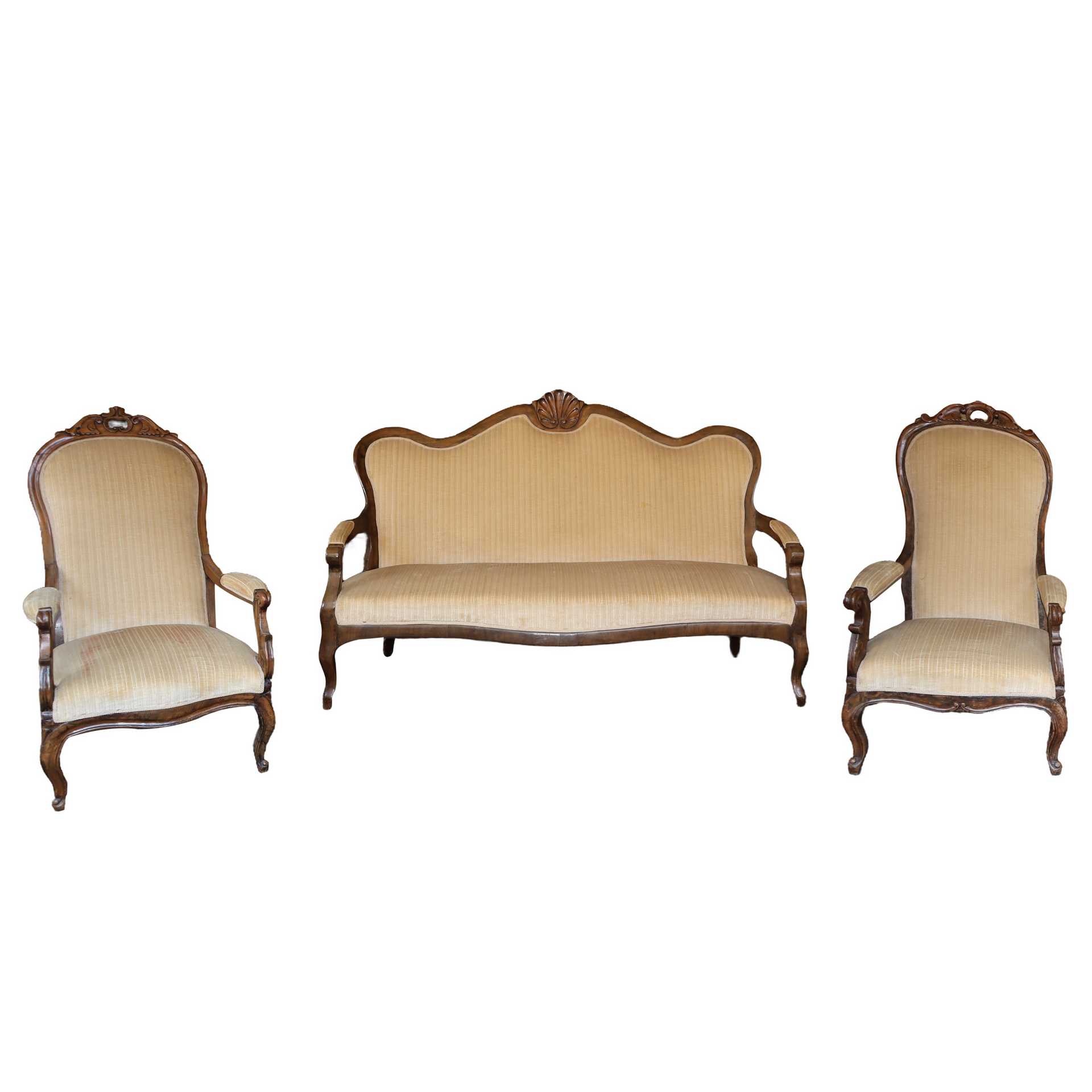Salotto composto da 2 poltrone e un divano tappezzato in velluto beige