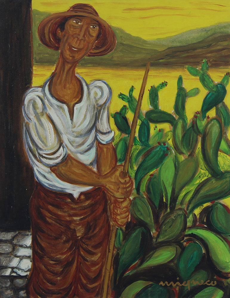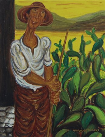 Migneco Giuseppe Contadino, 1982 olio su tela, cm. 45x35 firmato in basso a destra, firmato per autentica al retro, timbro Catalogo Generale Giuseppe Migneco a cura della Galleria Bonaparte di Milano al retro, certificato di autenticità della Galleria d'Arte BOXART di Thiene, certificato di archiviazione del Catalogo Generale Giuseppe Migneco su fotografia e firma dell'artista per autenticità
