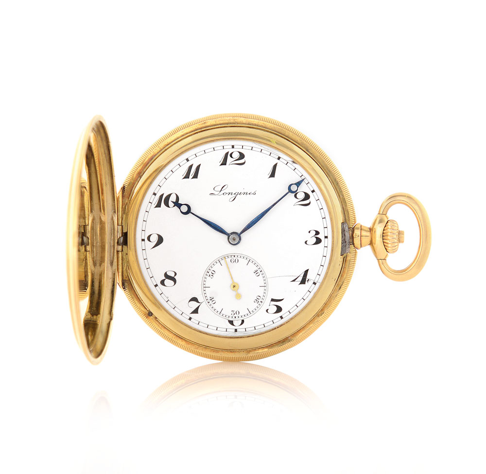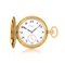 C. hunter case, 18K yellow gold with engraved vertical decorations on both cases, reeded band. D. white enamel with Arabic numerals. M. rhodium finished, keyless dress. Dial, case and movement signed.