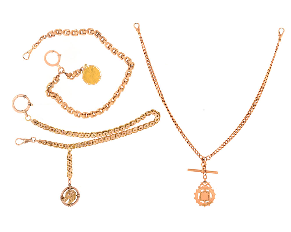 Three chain for pocket watch, pink gold, one 18K two 9K, two pendent and one coin.