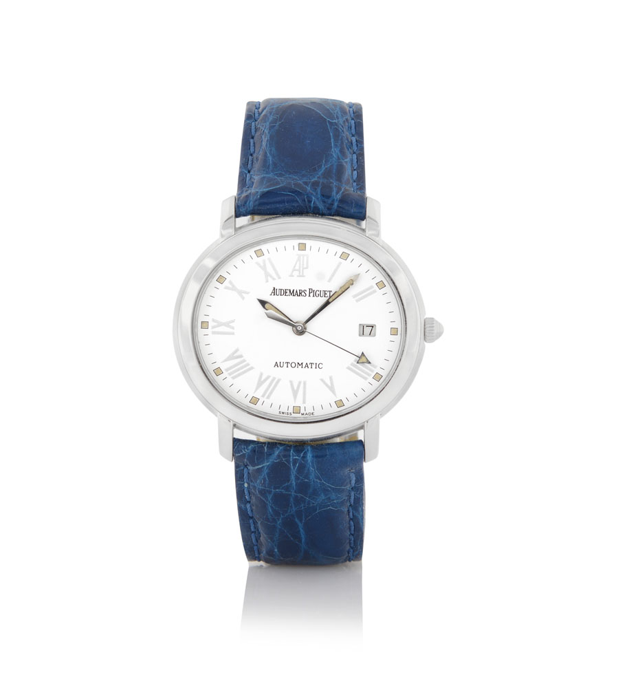 C. oval, stainless steel, case back secured by screws. D. black with luminous Arabic numerals and hands, centre seconds and date at 3. M. self-winding. Dial, case and movement signed. Accompanied by stainless steel Audemars Piguet buckle and box.