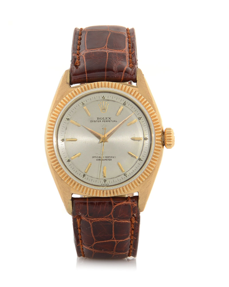 ROLEX OYSTER PERPETUAL REF. 6502 DEL 1954 CA. Cassa n. 36781 in oro giallo 18 kt con fondello e corona a vite, lunetta godronata. Quadrante argentato su due livelli con indici applicati e luminescenti, secondi al centro. Movimento cal. 1030 a carica automatica con rotore a farfalla. Quadrante, cassa e movimento firmati.