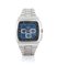 Cassa rettangolare bombata in acciaio con fondello a vite e pulsanti rettangolari. Quadrante blu con indici applicati e smaltati, contatore a 30 minuti e 12 ore, data tra le 4/5, scala tachimetrica periferica. Movimento a carica automatica. Bracciale in acciaio. Quadrante, cassa e movimento firmati.