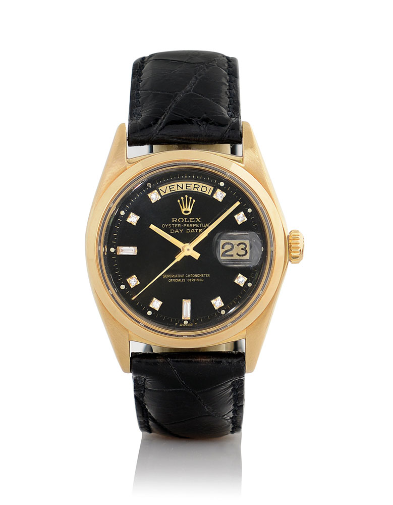 C. 18K yellow gold with screwed case back and crown. D. black lacquered with diamond indexes, aperture for day, Italian, at 12 and date at 3. M. self-winding. Dial, case and movement signed.