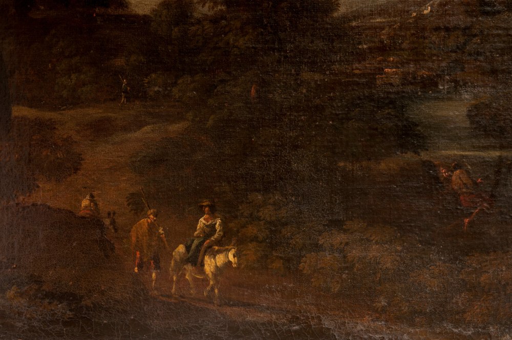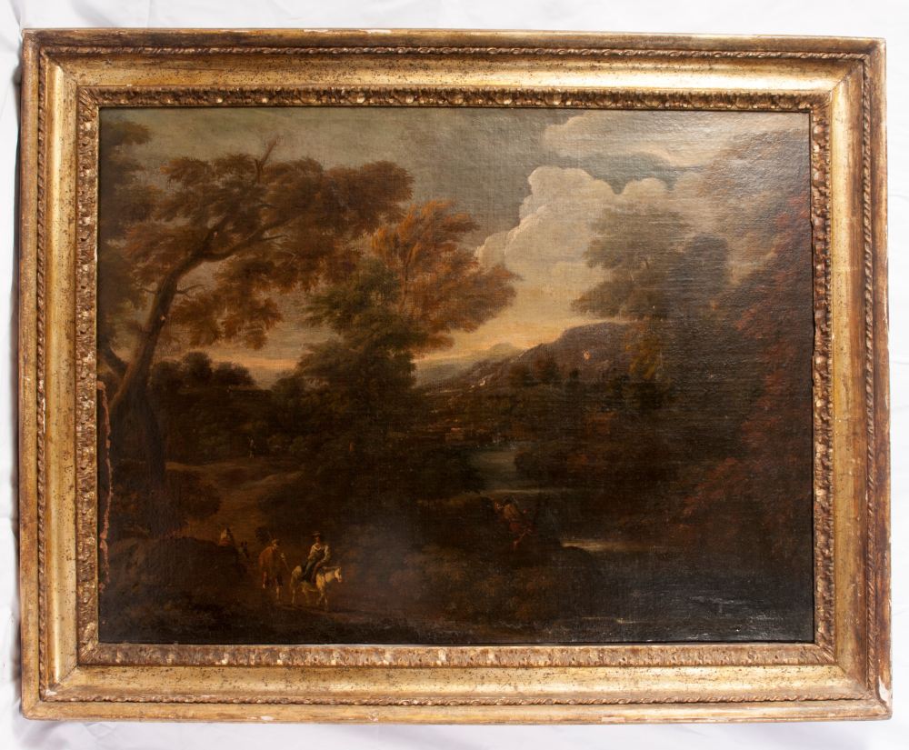 Scorcio di paesaggio con montagne, fiume e viandanti XVIII secolo dipinto ad olio su tela 73 x 98 cm