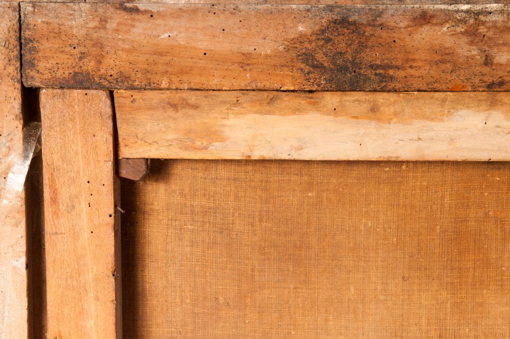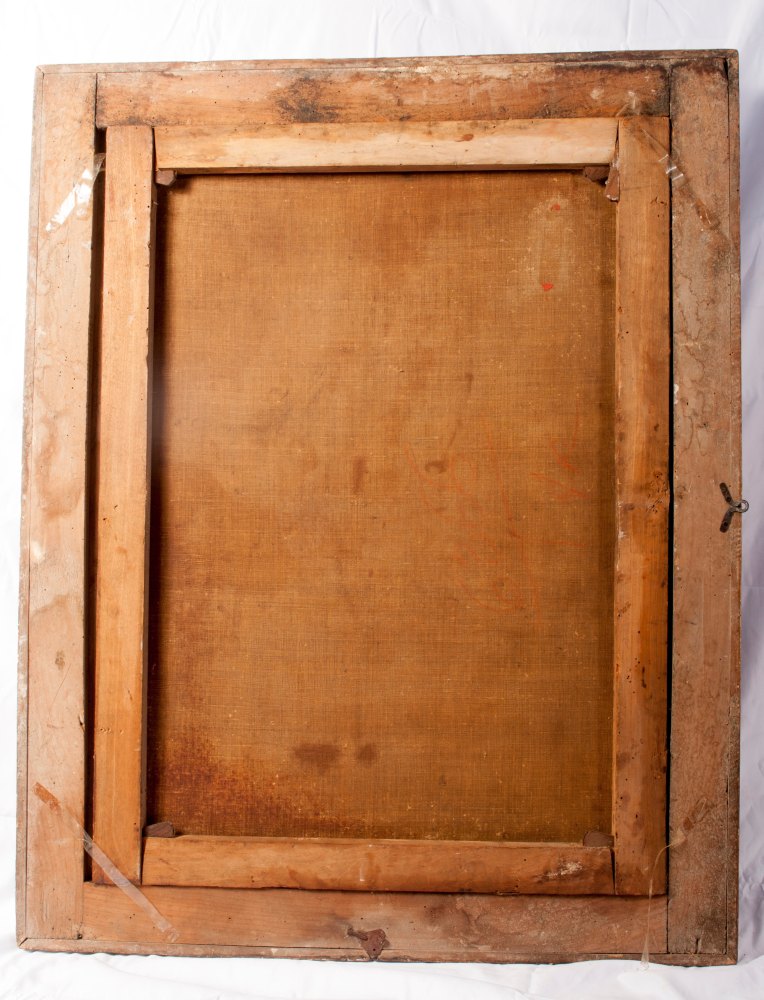 Stato di conservazione: rifoderato, piccole cadute di colore sparse e sul fianco sinistro una caduta di colore verticale, un piccolo foro al centro sulla destra