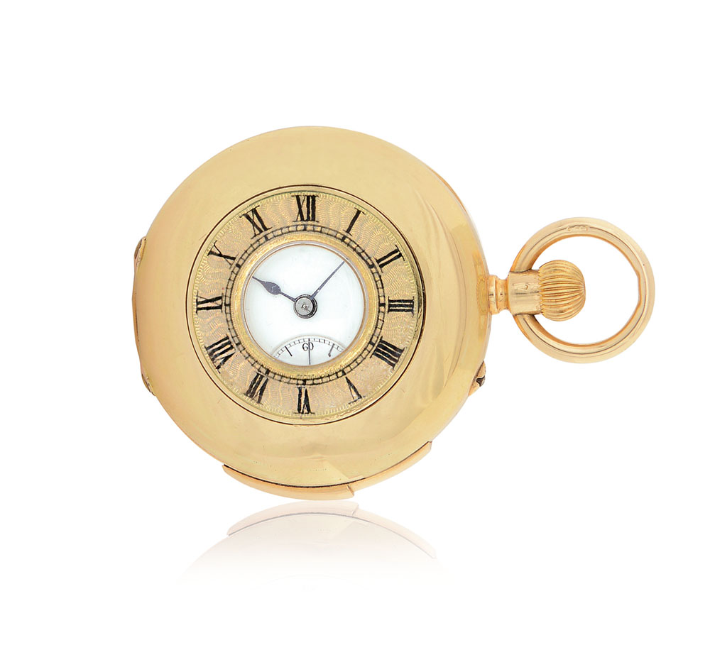 C. hunter case, 18K yellow gold, enamel bezel with painted Roman numerals, repeating slide in the band. D. white enamel with painted Roman numerals, subsidiary seconds. M. anchro escapement, quarter repeating.