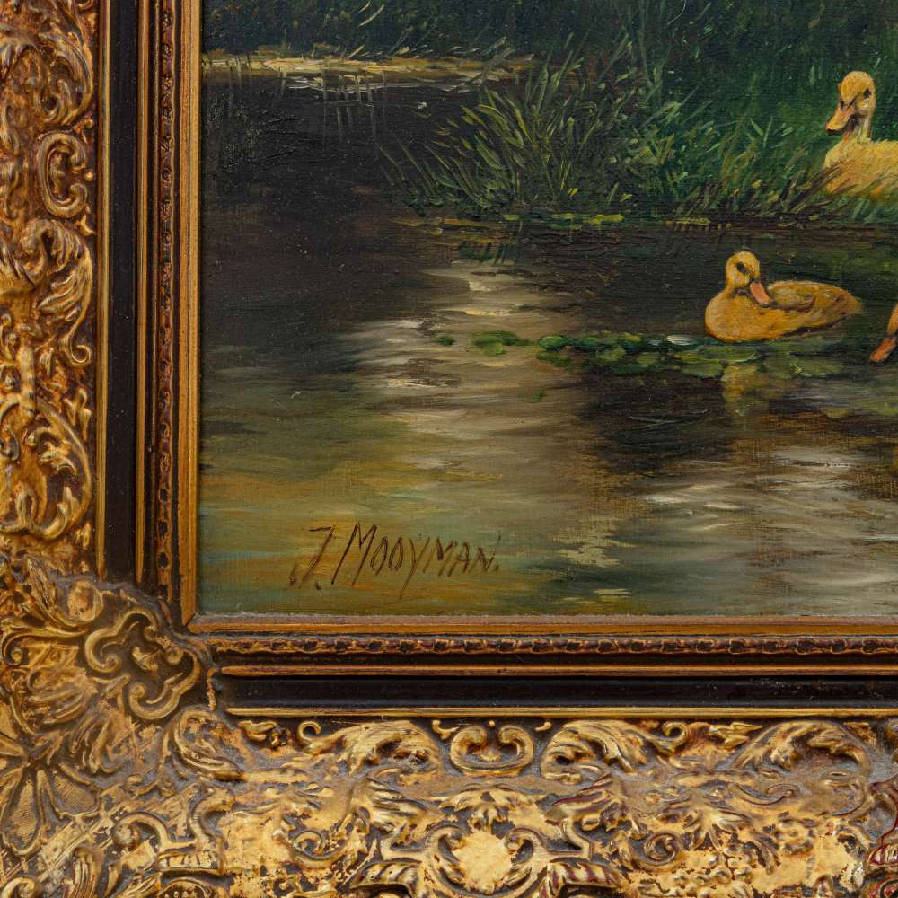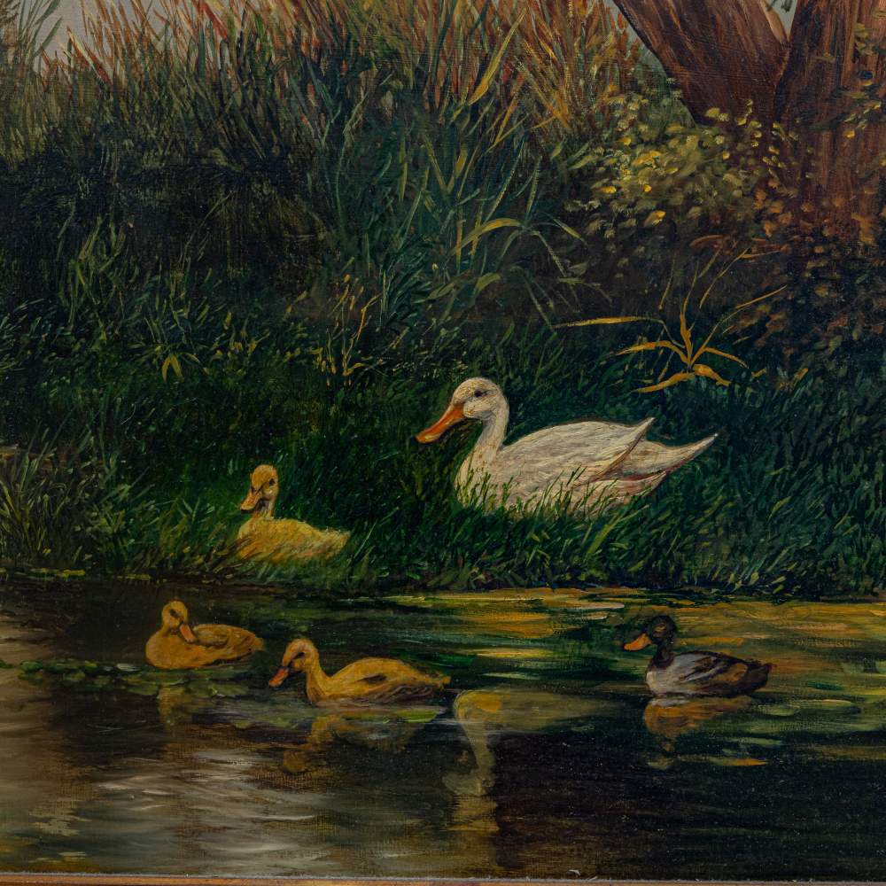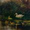 Scorcio di fiume con anatre ed alberi metà XX secolo dipinto ad olio su tavola 60 x 50 cm
