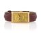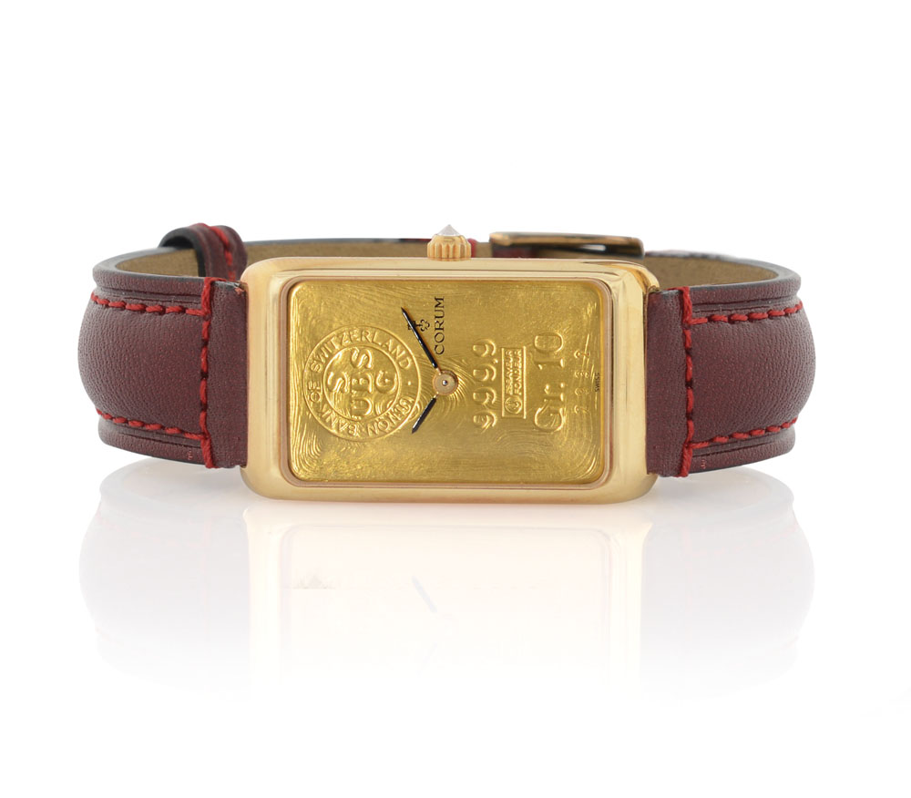 Cassa rettangolare in oro giallo 18 kt con fondello chiuso da viti e diamante in corona, vetro zaffiro. Quadrante in oro giallo costituito da un lingotto di gr. 10. Movimento a carica manuale. Quadrante, cassa e movimento firmati. Completo di fibbia originale.
