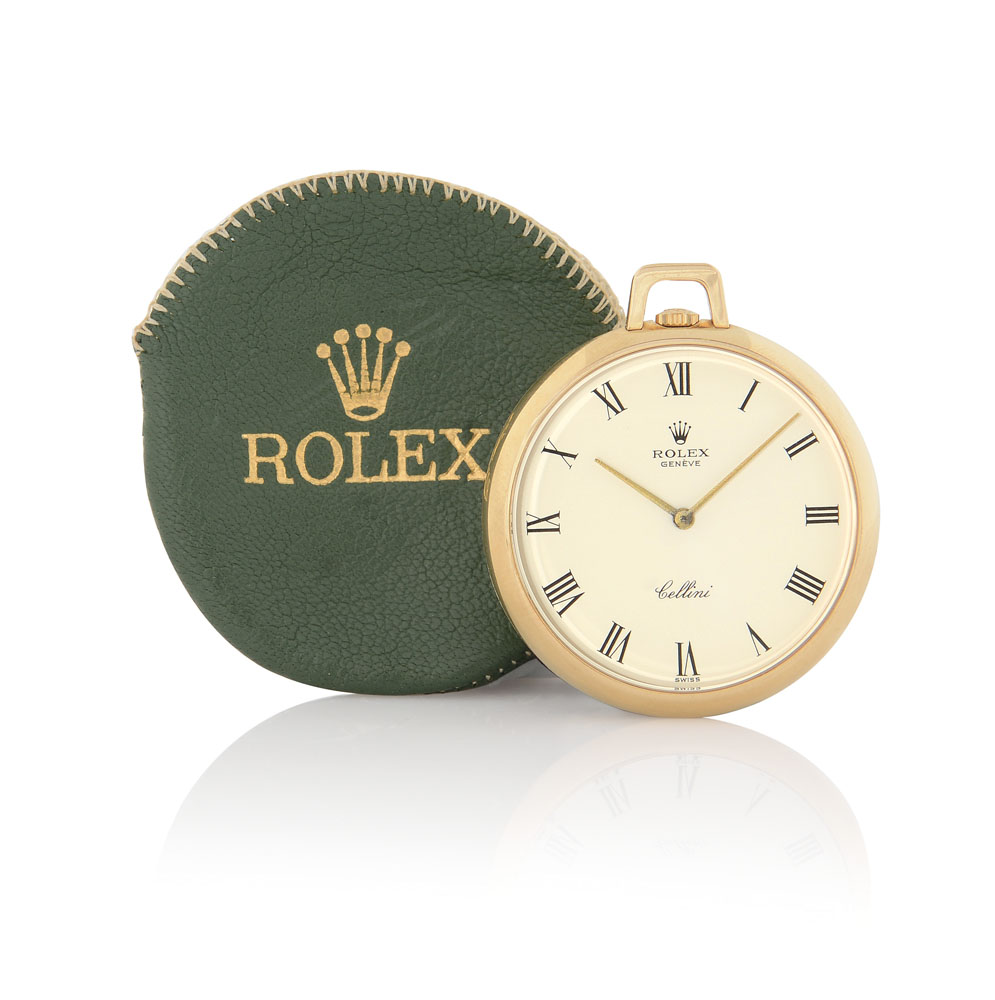C. 18K yellow gold. D. white with painted Roman numerals. M. anchor escapement, keyless dress. Dial, case and movement signed. Accompanied by Rolex leather case.