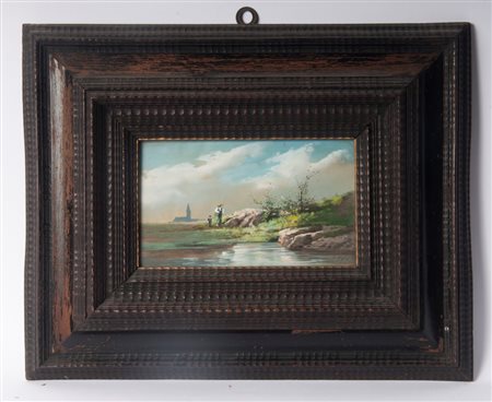 Paesaggio lagunare con pescatore prima metà XX secolo olio su stoffa 14 x 23 cm