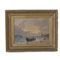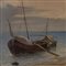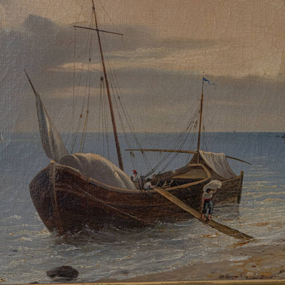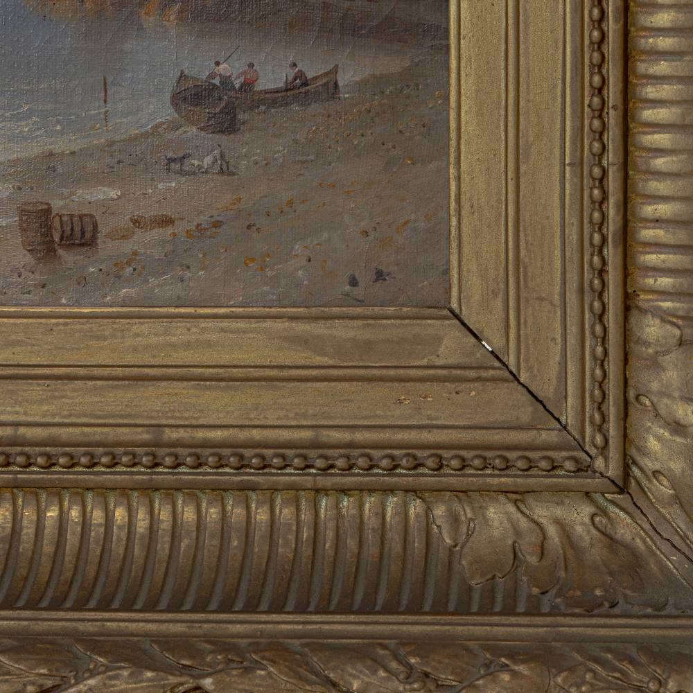 Scorcio di marina con barche, persone e costruzioni fine XIX secolo dipinto olio su tela 33 x 45,5