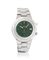 C. stainless steel with screwed case back, crown at 4 and round button at 2. D. green with applied indexes and date at 3. M. manual winding. Stainless steel bracelet. Dial, case, movement and bracelet signed.
