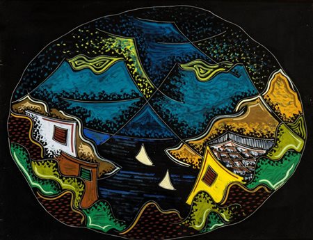 PIPPO ORIANI (Torino, 1909 - Roma, 1972) Angolo della costa ligure 1960/65 Encausto - graffito su cartone gessato 50 x 65 cm