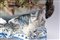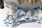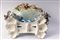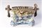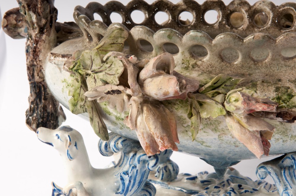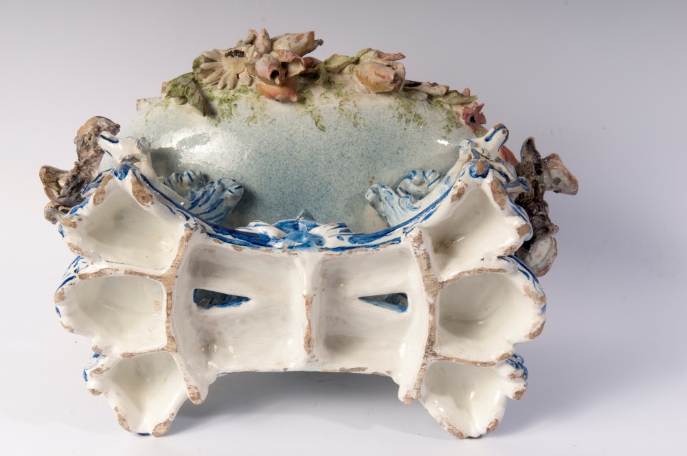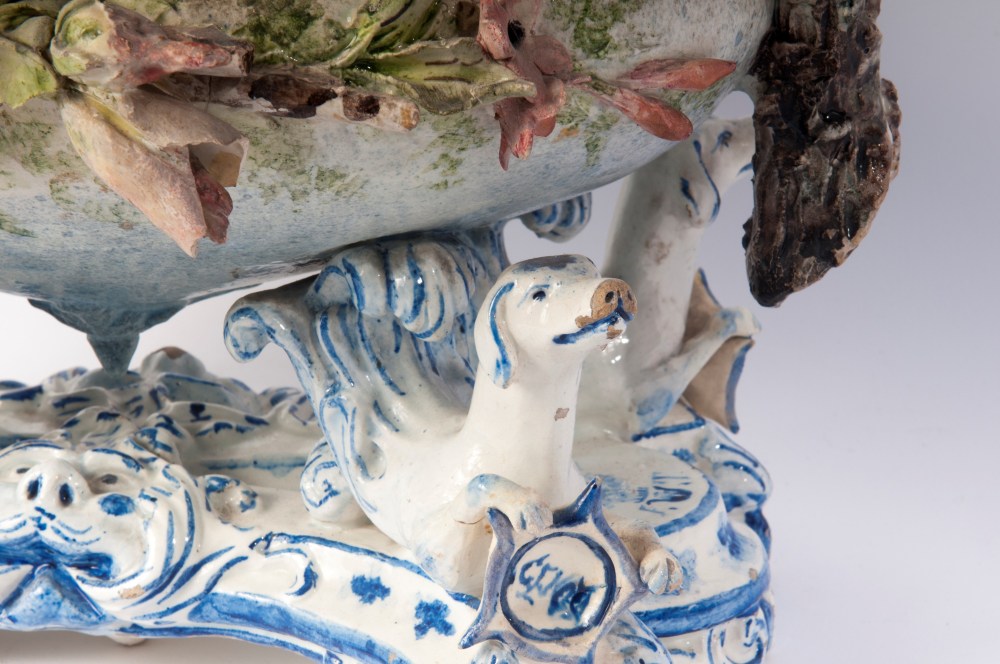 di forma ovale con canestro centrale poggiante su quattro animali fantastici. Vaso con decoro floreale a barbotina con anse a tronco. Alla base tra le zampe degli animali entro scudetti circolari nomi di città liguri. Manifattura ligure probabilmente savonese