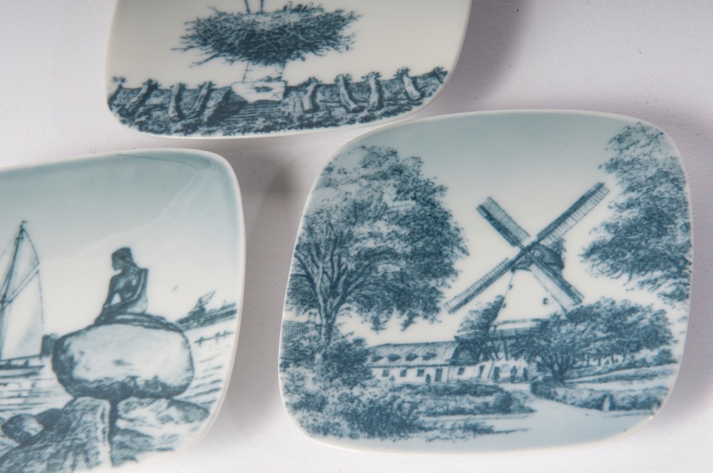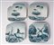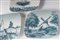 in porcellana policroma quadrangolari con decoro di animali e paesaggi in blu su fono bianco. Firma della manifattura in verde sotto smalto