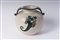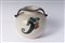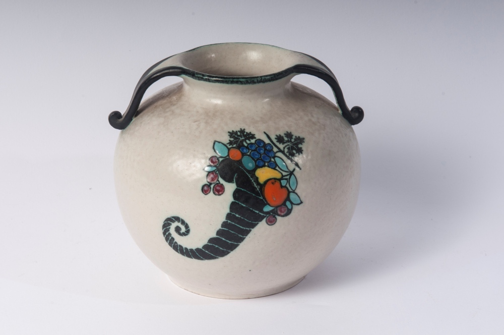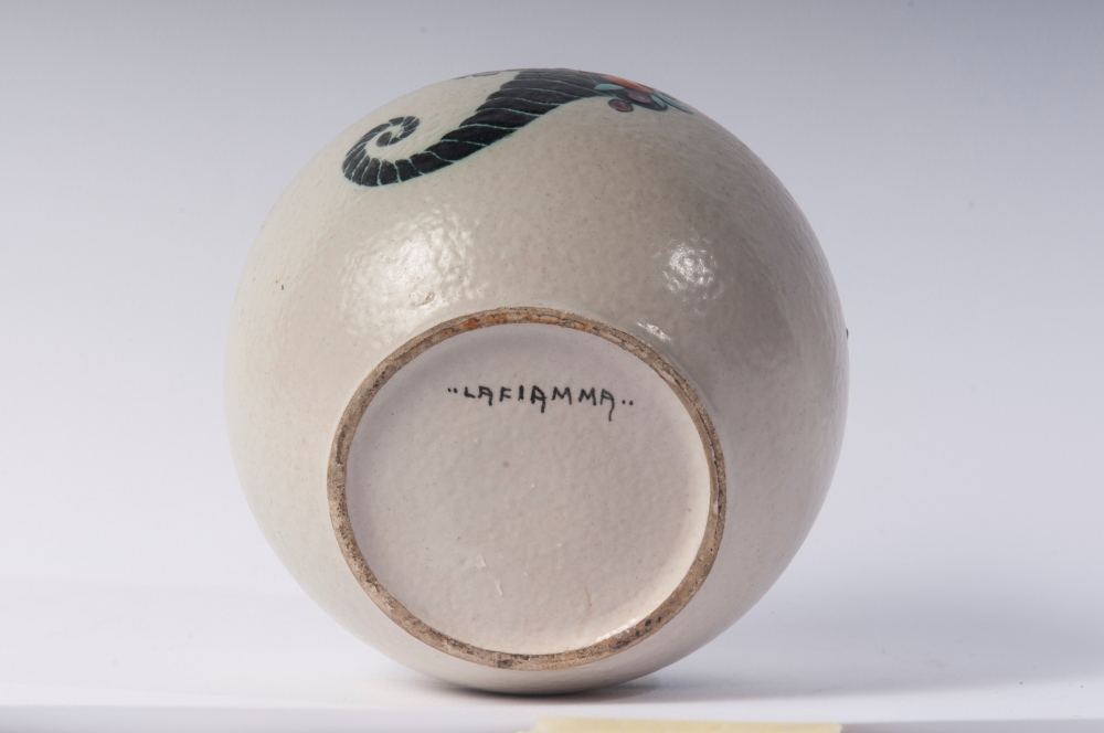 con anse a nastro. Decoro a buccia d'arancia su fondo bianco, con coppia di cornucopie fruttate per ogni lato. Finitura a ramina lungho i bordi. Firma della manifattura in nero alla base sotto smalto " LA FIAMMA" di Ivos Pacetti, Albissola.