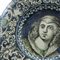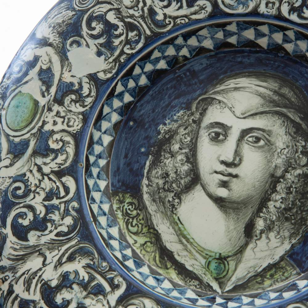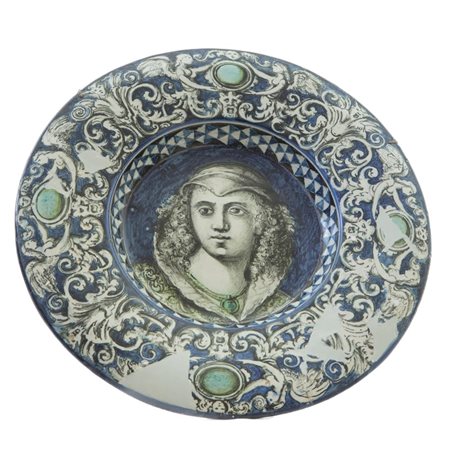 dall'ampia tesa con orlo leggermente ribassato, corta balza, e fondo piano. Decoro sulla balza a girali fitomorfe e figure fantastiche. Al centro del piatto ritratto di giovane fanciulla identificabile con la scritta al retro. Manifattura Penazzi