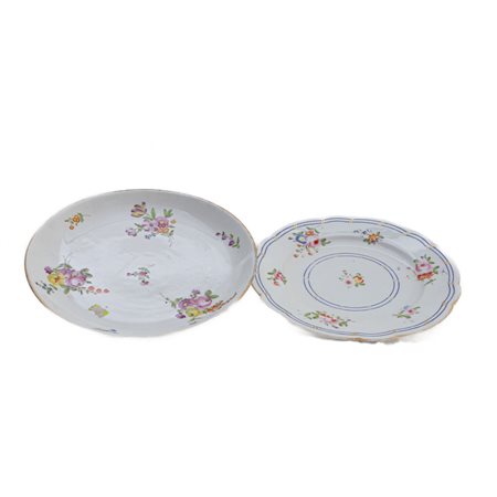 un piatto da coltello in porcellana bianca con orlo polilobato mistilineo e dal fondo ribassato ad anello. Decoro a mazzetti di fiori in policromia con finiture in oro zecchino e fasce in blu cobalto. Al retro marchio della manifattura di difficile lettura. L' altro piatto in porcellana bianca con fondo ribassato ad anello e decoro a mazzetti di fiori sciolti con finitura in oro zecchino lungo orlo. Al retro marca della manifattura in blu cobalto