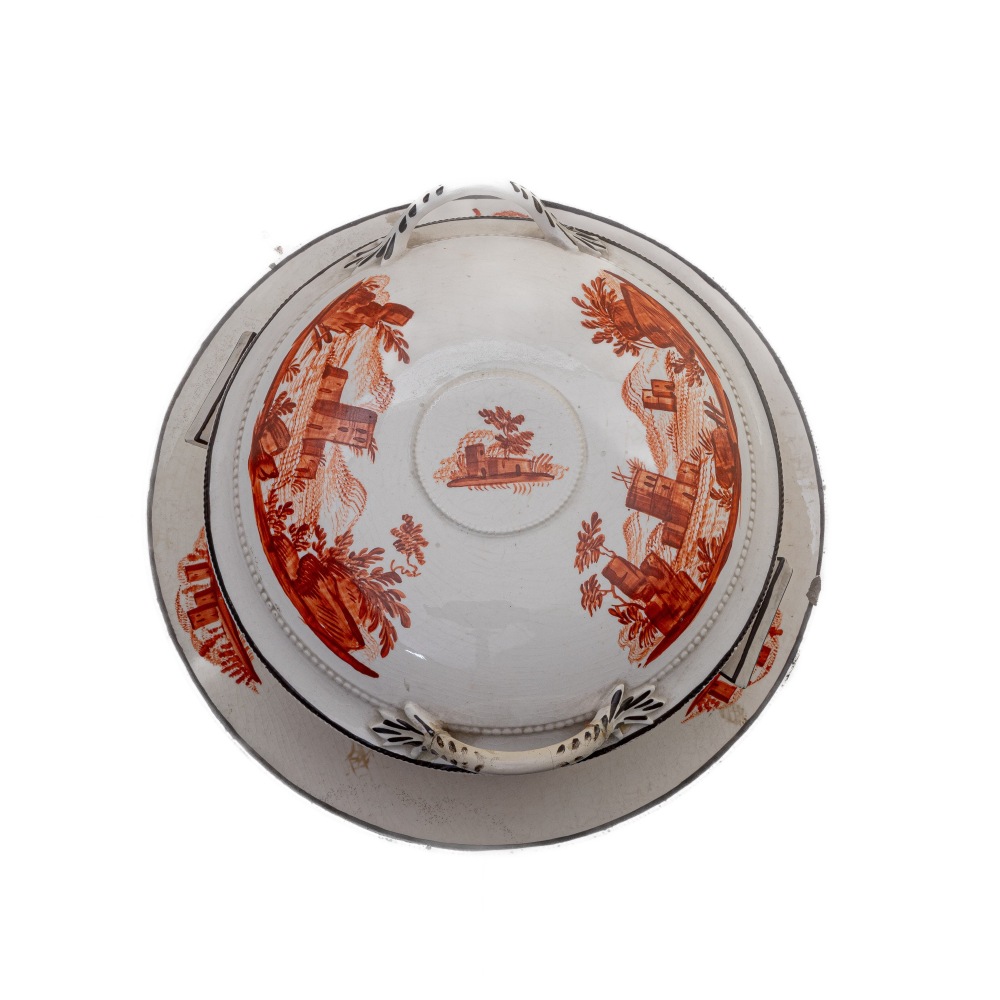 in terraglia bianca con decoro a rovine entro paesaggio in ocra, finiture lungo i bordi e le anse in nero. Forma del piatto tonda con al retro fondo leggermente ribassato. Forma a vasca rotonda con prese del corpo rettangolari e presa del coperchio a ponte. Lungo i bordi finiture con perlinatura a rilievo. Manifattura probabilmente veneta.