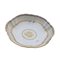 profilo polilobato mistilineo con fondo ad anello ribassato. Leggere costolature lungo il corpo che dall' orlo scendono verso il cavetto. Orlo del piatto decorato in oro zecchino da cui parte una riserva con puntinatura oro e verde individuata da una doppia fascia con elementi geometrici in oro, porpora e verde. Fondo del cavo con decoro a mazzo di fiori entro riserva dorata