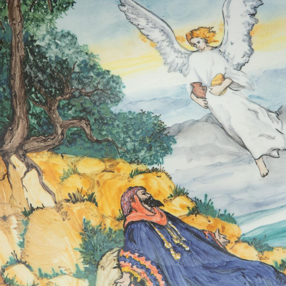 Elia nutrito da un angelo, piatto da pompa in ceramica policroma 1998 41 x 5 cm