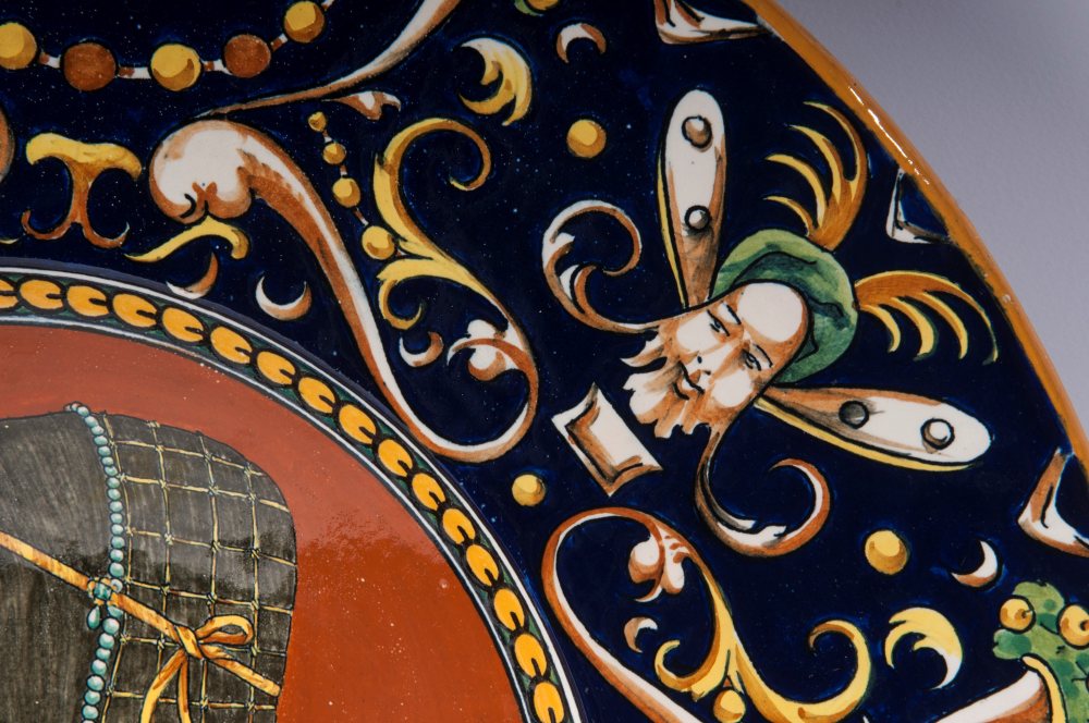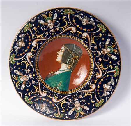 policroma dalla larga tesa e dal profondo cavo con al retro appoggio ad anello su fondo ribassato. Decoro a raffaellesche stilizzate su fondo blu sulla tesa, profilo di dama su fondo ocra a tutto campo nel cavo, retro a smalto bianco. Manifattura fratelli Minardi Faenza