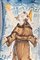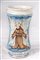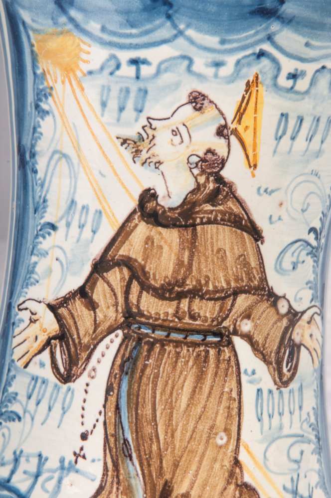 corpo leggermente rastremato al centro con spalla e base arrotondate. Orlo superiore estroflesso con base a disco tagliato alla stecca. Foggiatura al tornio. Decoro in policromia su fondo bianco con S. Francesco che riceve le stimmate entro riserva orlata di blu. Raffigurazione ripresa dalla tradizione rinascimentale delle ceramiche derutesi. Alla base entro fascia iscrizione farmaceutica.