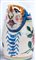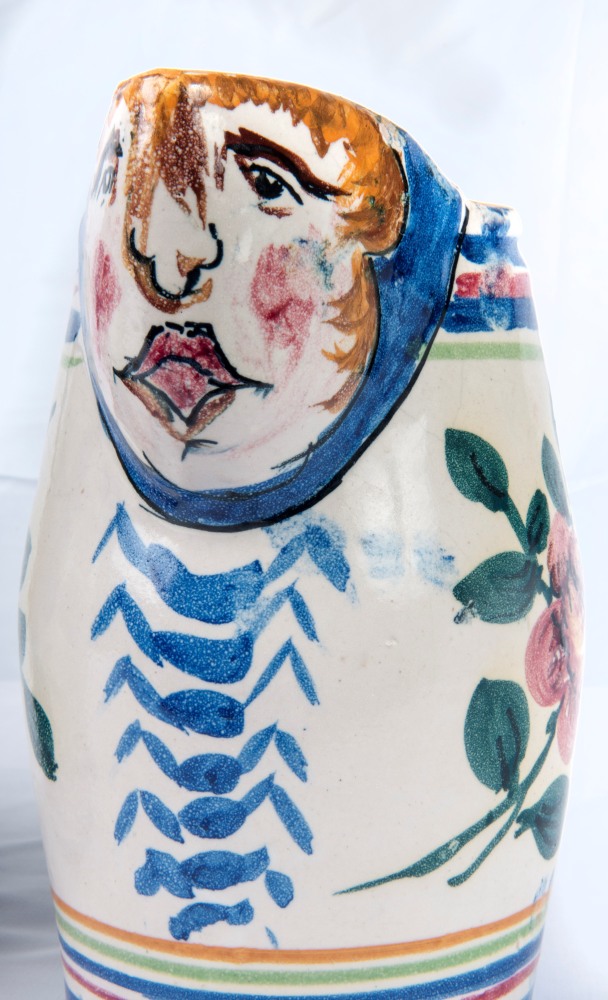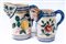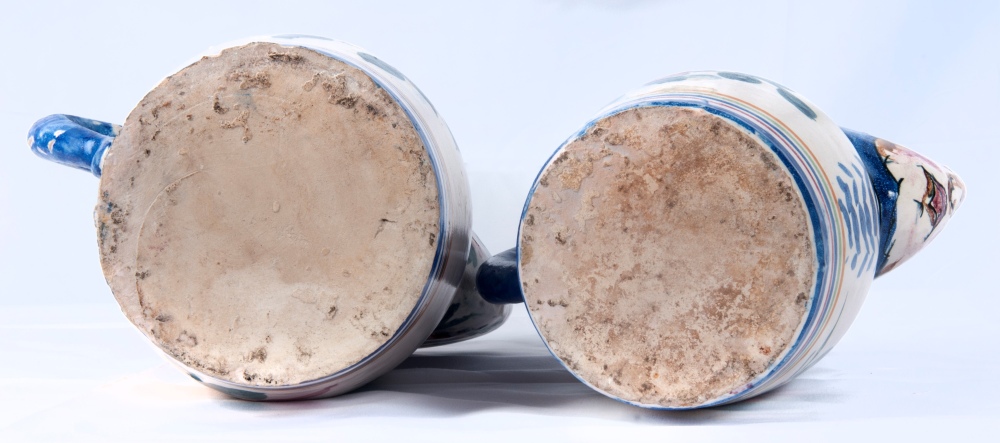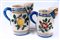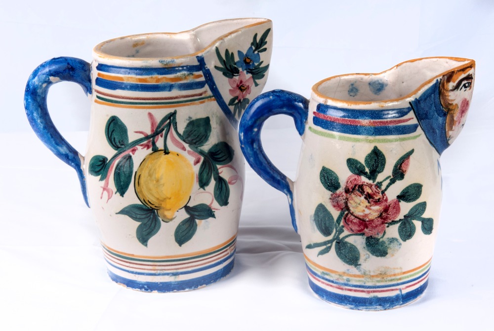 in ceramica policroma con decoro a fiore e frutta l'uno e a fiori e testa di putto l' altro. Dal corpo leggermente a botte con presa ad orecchio. Versatoio a becco. Manifattura probabilmente vietrese.