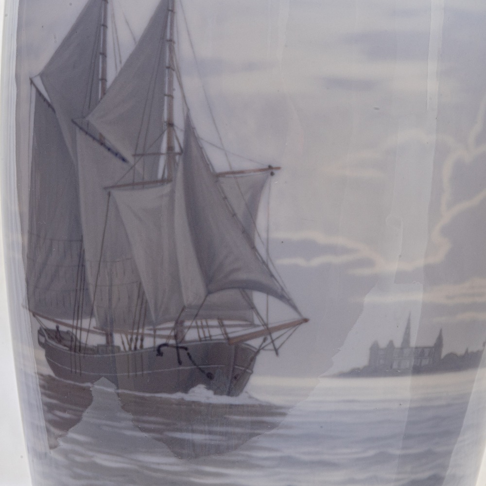 in porcellana policroma, di forma a balaustro con decorazione a paesaggio in grigio sfumato su sfondo bianco. Manifattura Royal Copenaghen
