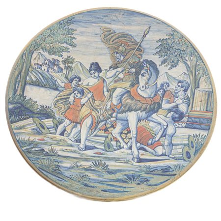 in ceramica policroma, a lustro oro e rubino con rappresentata scena di invenzione, ispirato alle tavole di Bartolomeo Pinelli sulla storia di Roma antica. Al retro appoggio ad anello su fondo leggermente ribassato con sigla della manifattura Società Ceramica Umbra (S.C.U. ) entro triangolo in blu. Manifattura fratelli Rubboli.