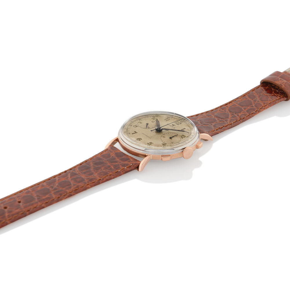 Cassa n. 63209 in acciaio e oro rosa con carrura e anse curve godronate, pulsanti rettangolari. Quadrante argentato con numeri arabi e lancette luminescenti, contatore a 30 minuti e scala tachimetrica periferica. Movimento a carica manuale. Quadrante, cassa e movimento firmati.