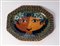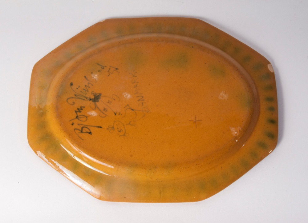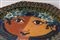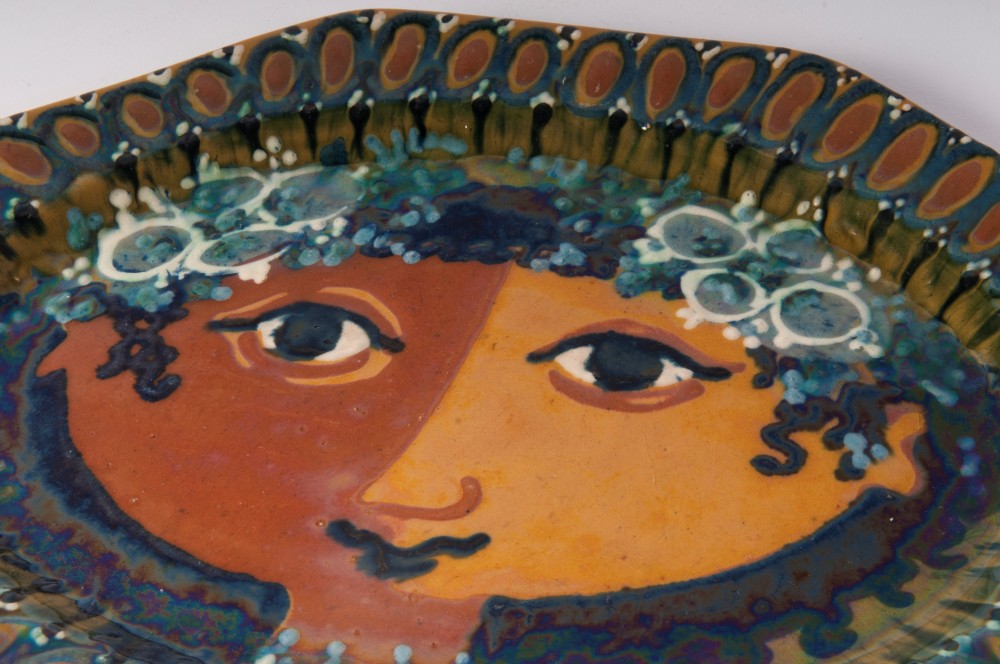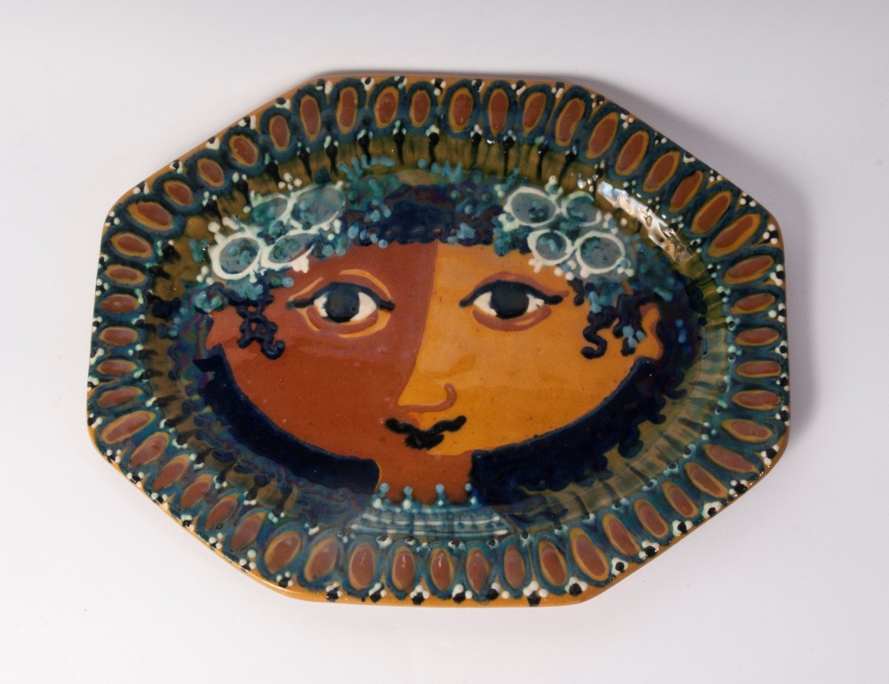 piatto in ceramica policroma di forma ottagonale con tesa a decoro geometrico e nel fondo volto stilizzato. Firma dell'autore in bruno sotto smalto al retro