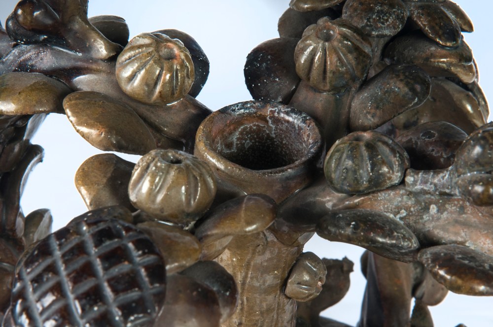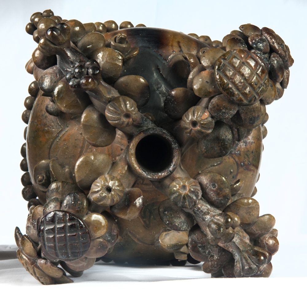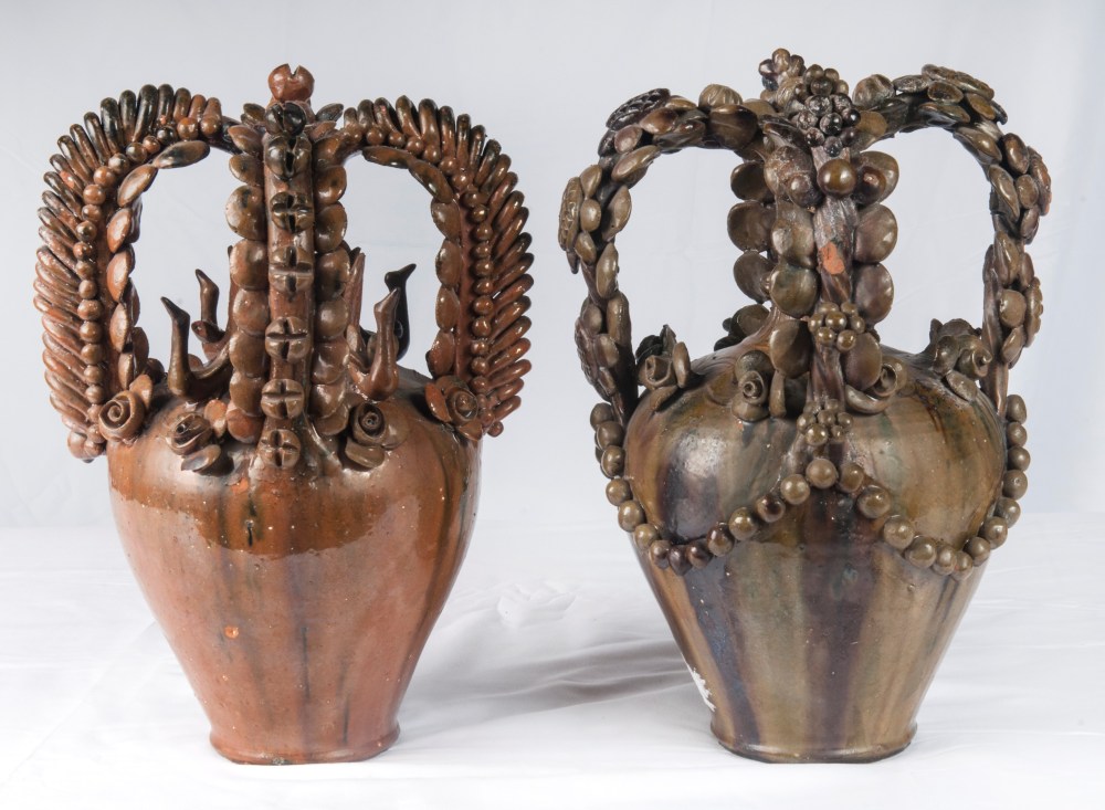 con quattro manici. Decoro in rilievo ad animali, frutti e fiori. Un'anfora è di colore verde marcio, l'altra di color ocra. Manifattura Farci, Assemini, con marchio sotto la base.