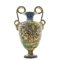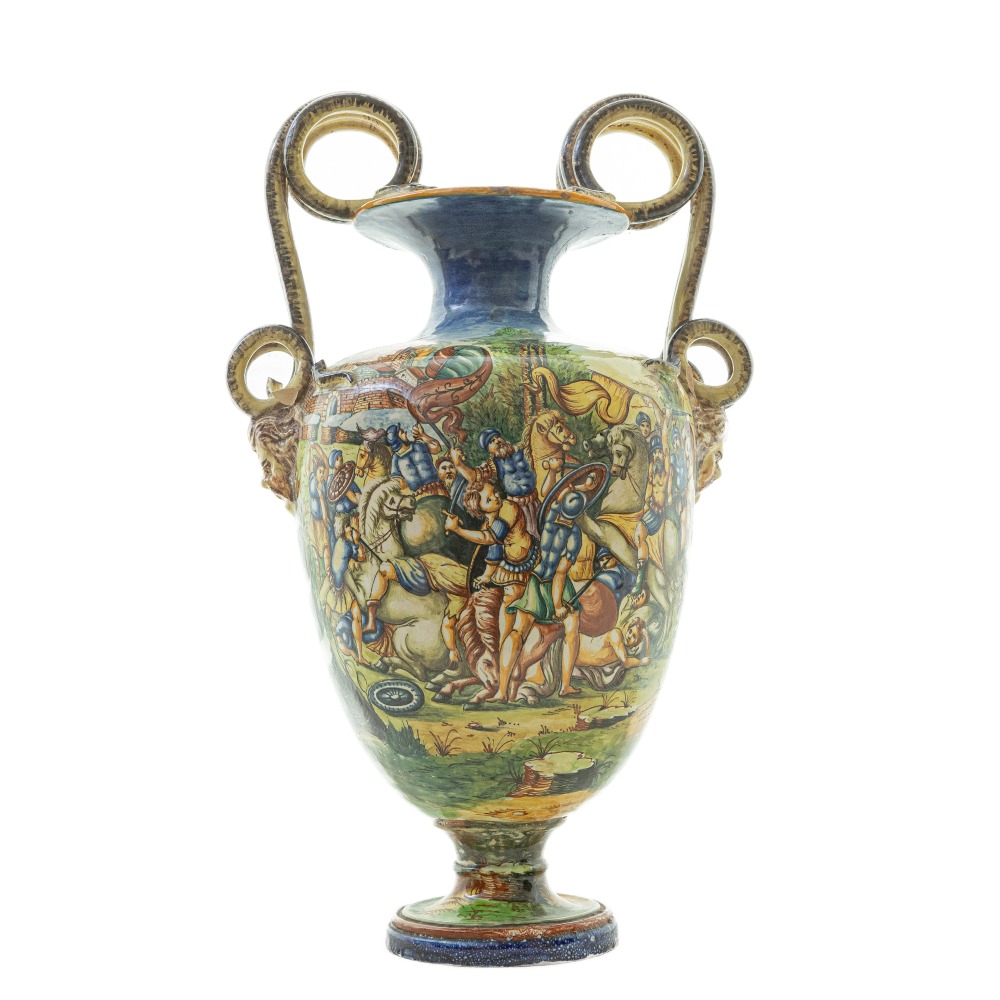 in ceramica policroma, con prese a serpente poggianti su teste stilizzate. Piede con corto collo ad appoggio anulare, decorazione istoriata con scena di battaglia su un lato e scorcio di fiume con montagne sull'altro. manifattura Fratelli Minardi, primo quarto XX secolo Faenza