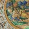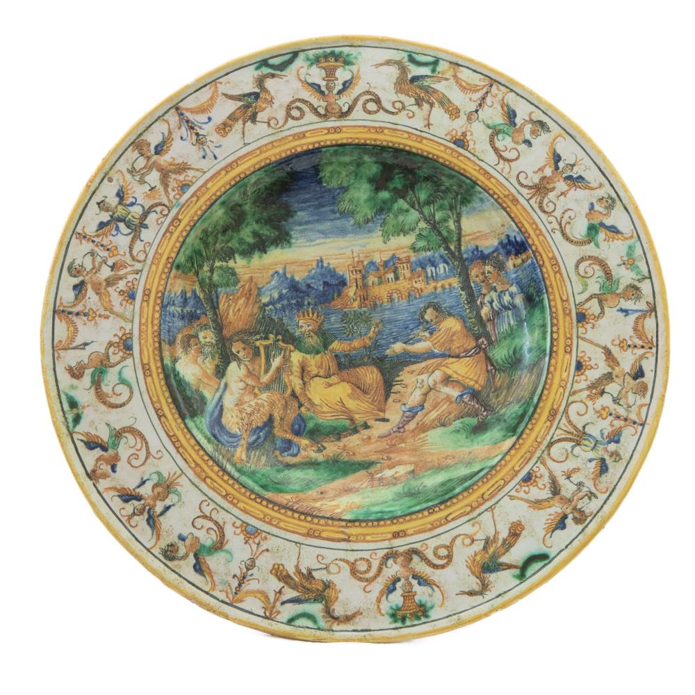 in ceramica policroma, dalla larga tesa, corta balza e d ampio fondo. Retro con appoggio ad anello. Decoro sulla tesa ad arpie ed animali fantastici su fondo avorio. Nel cavo scena tratta dall'antico, probabilmente Re Mida, entro paesaggio con personaggi, satiri e costruzioni. Produzione area metaurense con traccia di iscrizione in manganese sotto smalto al retro.