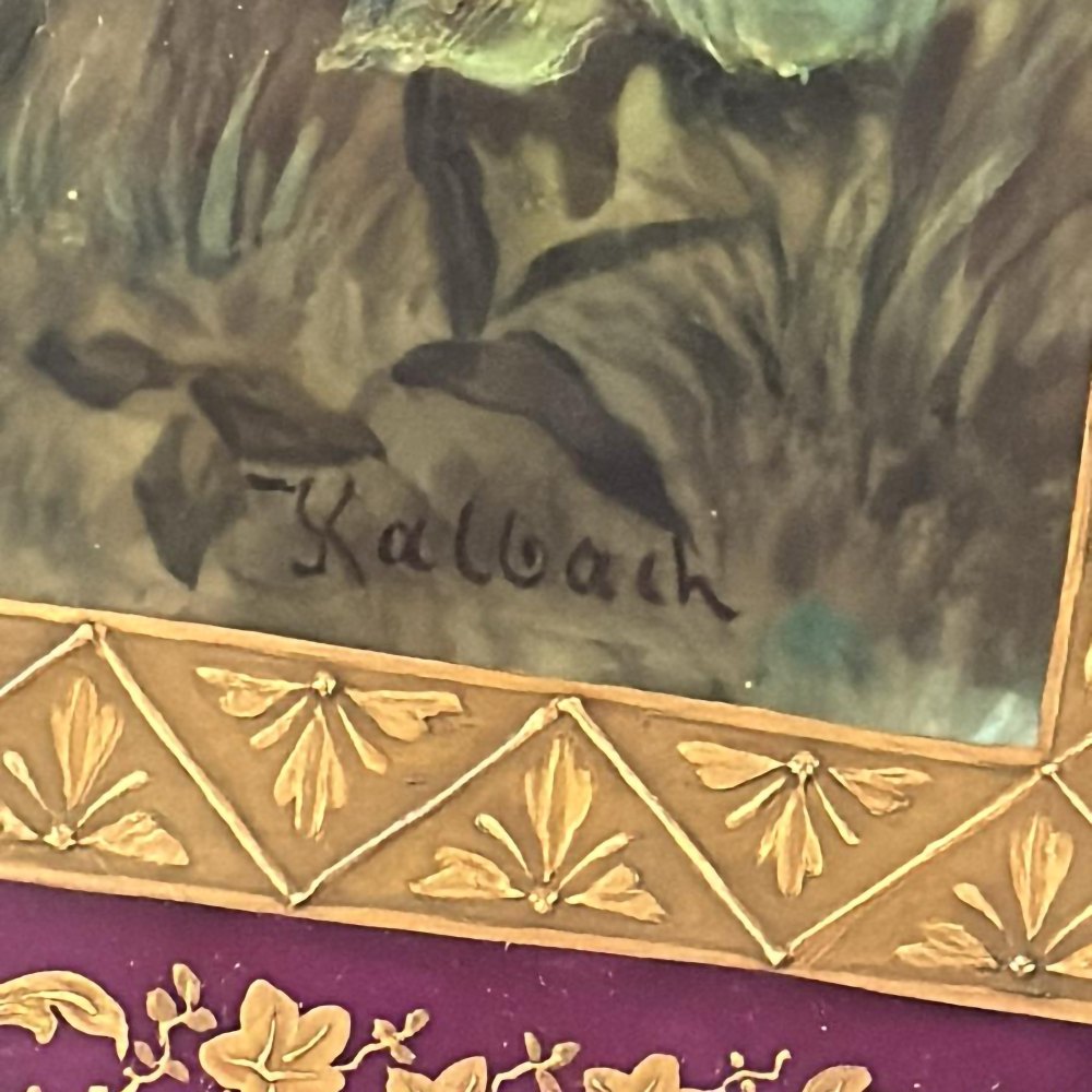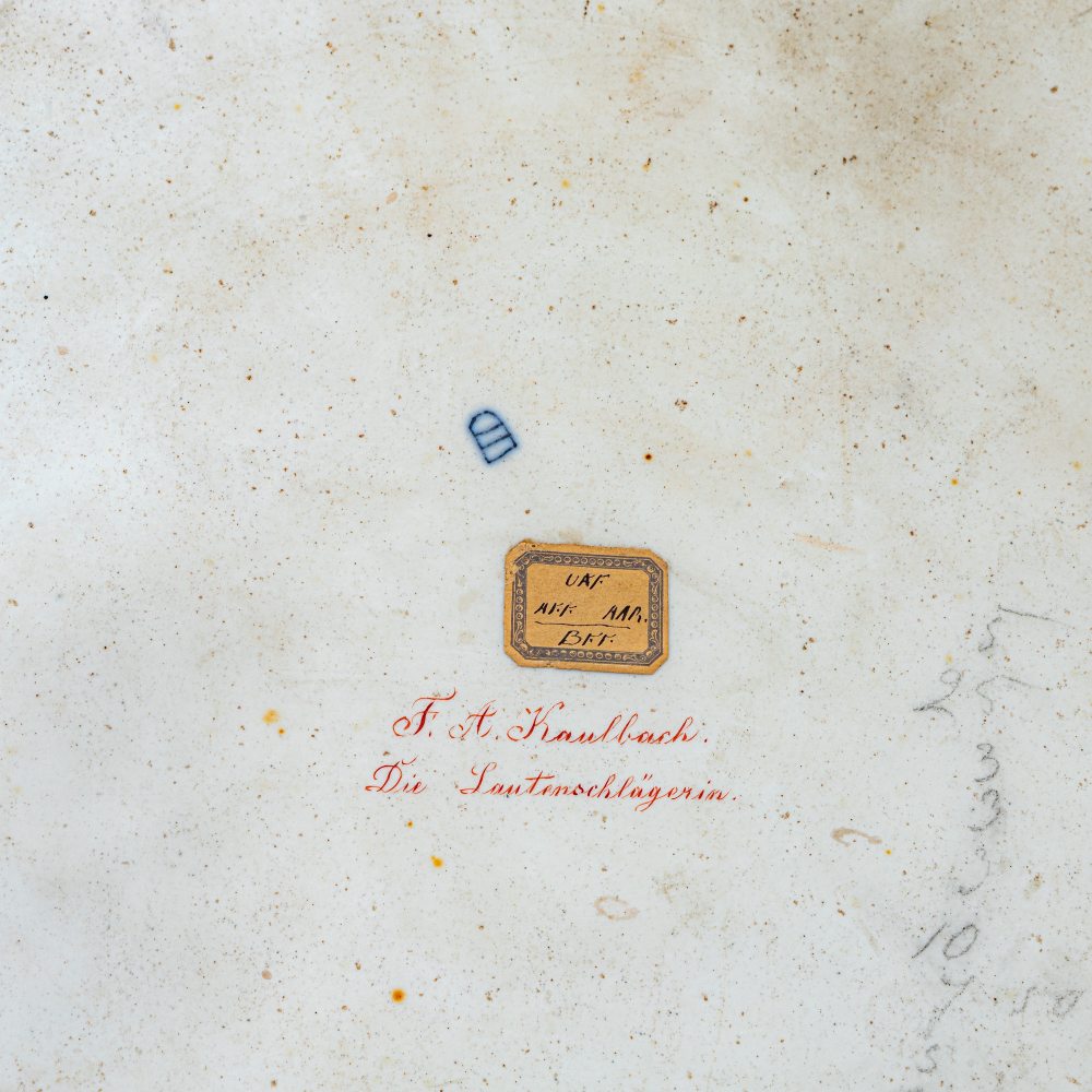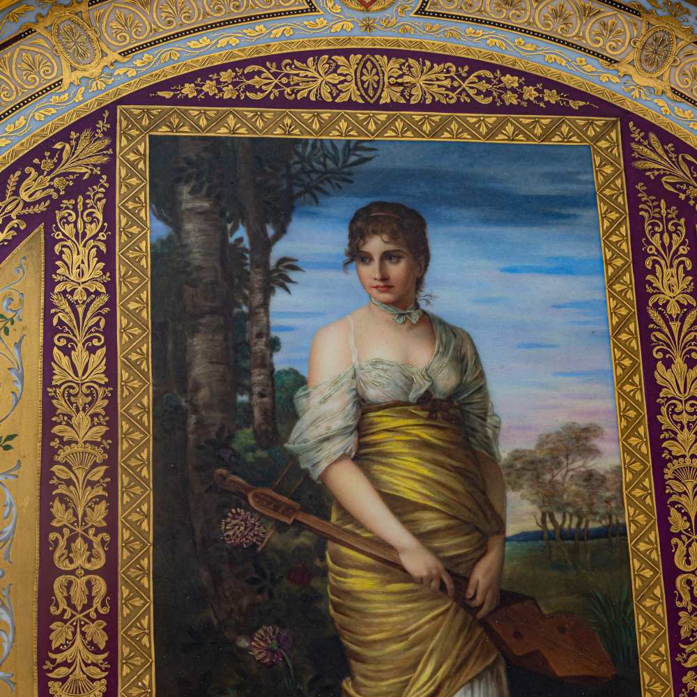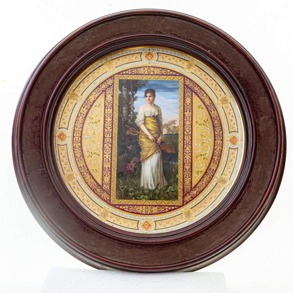 piatto in porcellana policroma, ripresa da una celebre tela di August von Kaulbach entro cornice in legno. Manifattura di Vienna, fine XIX inizio XX secolo. Piatto firmato sotto smalto al verso e al tergo con iscrizione e dedica.