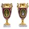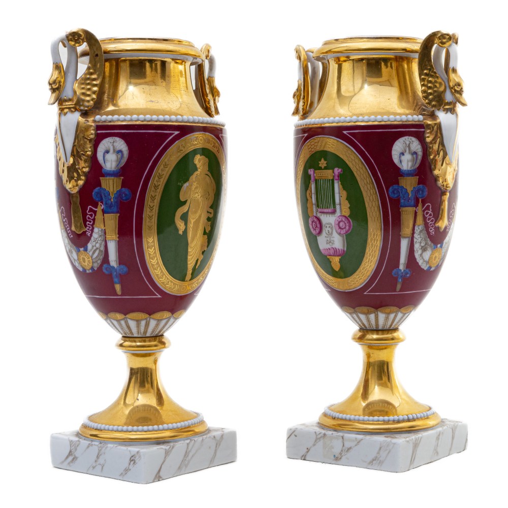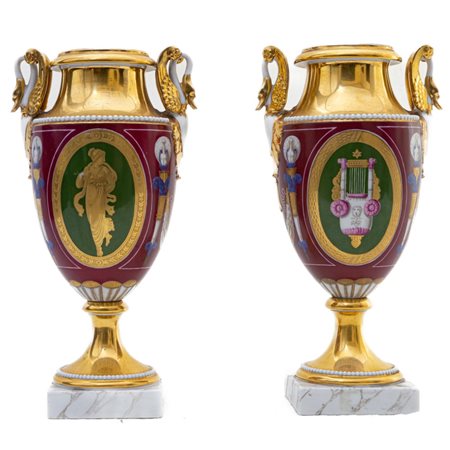 in porcellana policroma, corpo ad urna che termina con piede tondo perlinato su base quadrata. Collo ad imbuto con coppia di prese a cigno. Decorazioni a riserve su fondo rosso con profili mulieri e festoni di frutta. Collo, piede e finiture in oro zecchino.