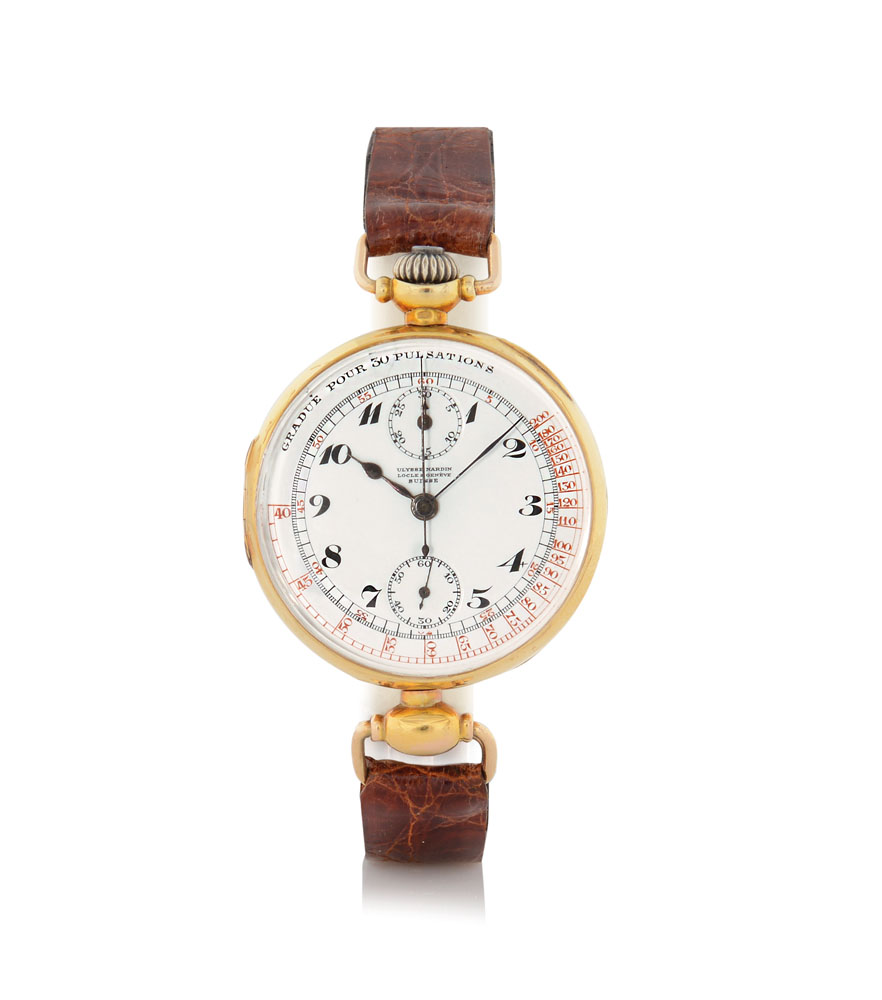 Cassa n. 357717 in oro giallo 18 kt con doppio fondello e lunetta a cerniera, anse mobili e pulsante in corona al 12. Quadrante in smalto bianco con numeri Breguet contatore a 30 minuti al 12, scala medicale periferica. Movimento a carica manuale. Quadrante, cassa e movimento firmati.