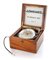 Cassa in acciaio con fondello a vite basculante entro anello fissato alla cassa esterna in legno con targa esterna Longines, pulsante cronografo all'8, regolazione dei secondi al 5, carica al 12, leva start/stop al 10. Quadrante argentato a due toni con divisione dei secondi in blu, divisione a 360 gradi e gradi in rosso all'interno, riserva di carica (30 ore). Movimento rodiato cal. 21.29 n. 5789285 a carica manuale. Quadrante e movimento firmati, cassa punzonata con numero 6. Completo di certificato di registro di Longines.